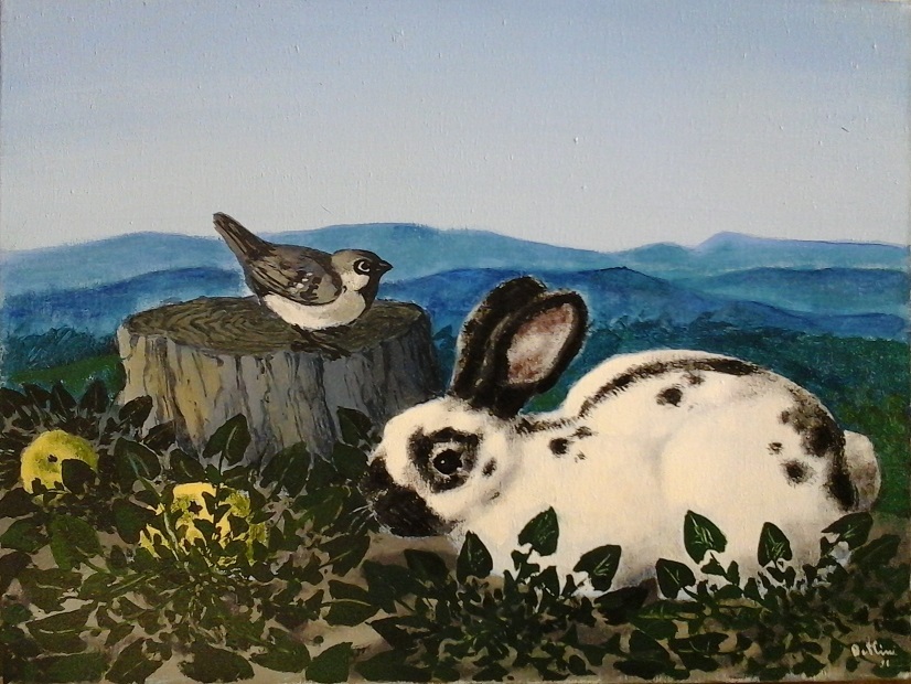 Enzo Bellini - Coniglio e uccellino - Olio su tela cm.30x40 - firmato in...