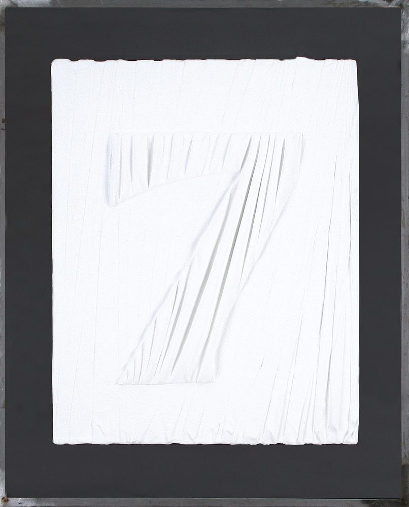 UMBERTO MARIANI Milano 16/11/1936 La forma celata: 7, 2009 acrilico su piombo operato applicato su tavola cm. 42,5x34, con cornice dell'artista cm. 56x45, firma, titolo e anno al retro, dichiarazione d'autenticità dell'artista su 2 foto.