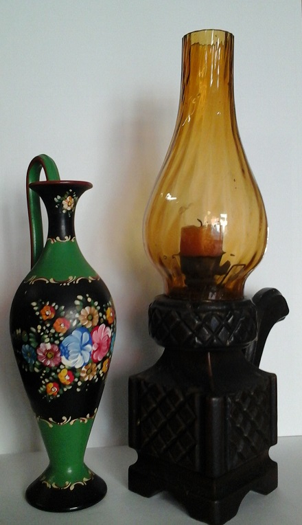 Un versatoio in ceramica decorato a mano firmato Gialletti - Deruta h.cm.26 ed un lume in legno intagliato h.cm.34