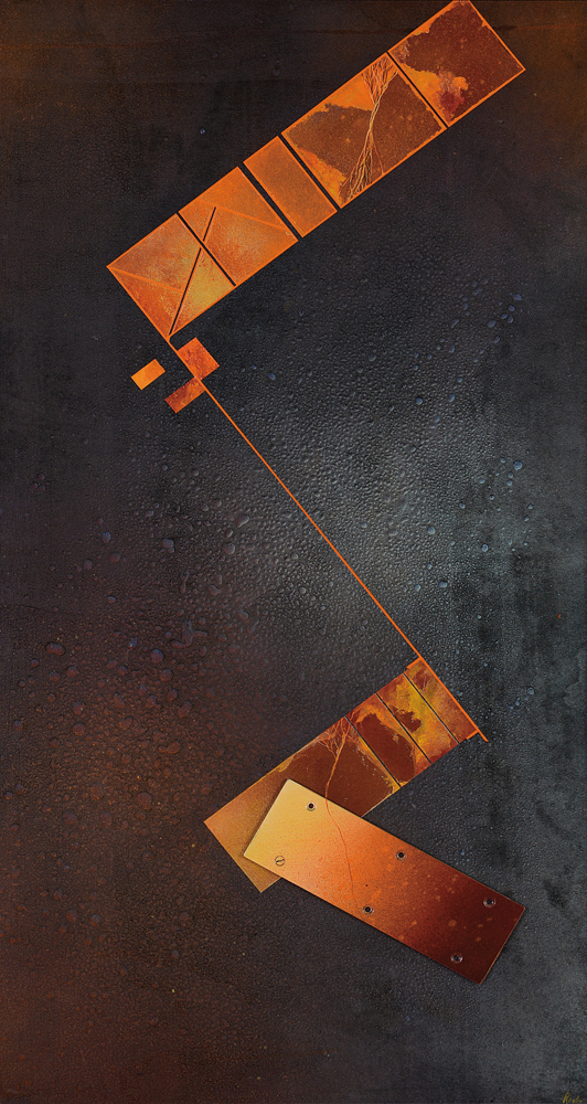 MAURIZIO ROASIO Vercelli 1946 Senza titolo tecnica mista e applicazioni su tavola cm. 100x54, firma in basso a destra.