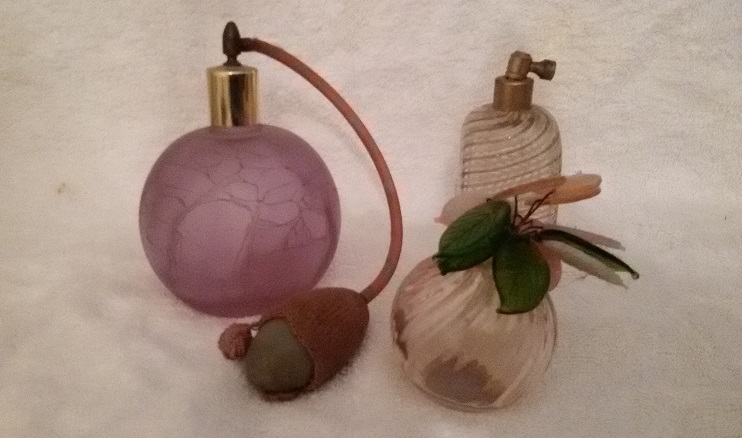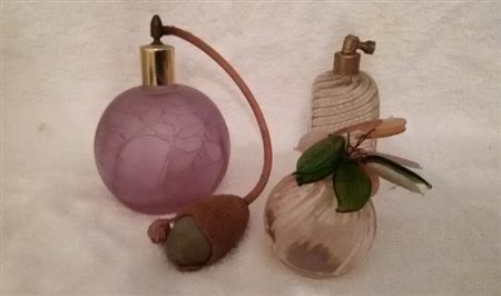 Due flaconi da profumo in vetro e una boule con foglie in vetro, difetti