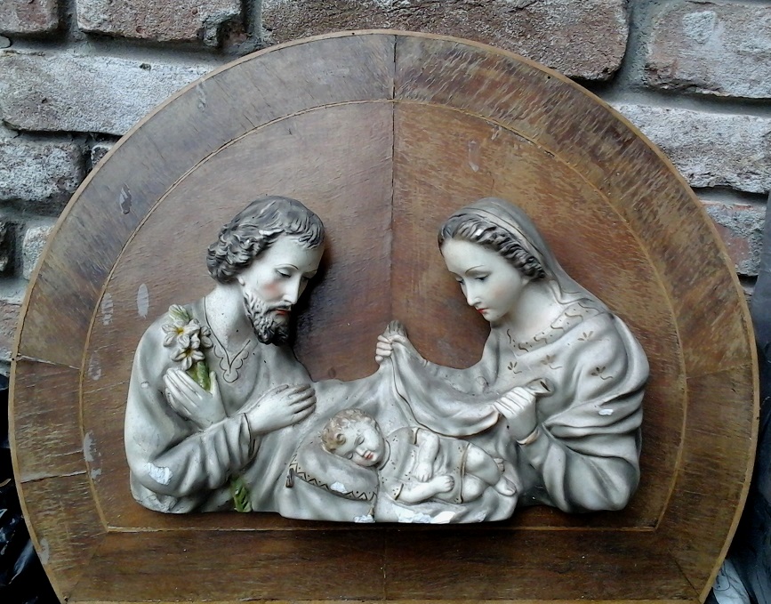 Capoletto in legno e radica con Sacra Famiglia in ceramica ad altorilievo cm. 40x50, difetti