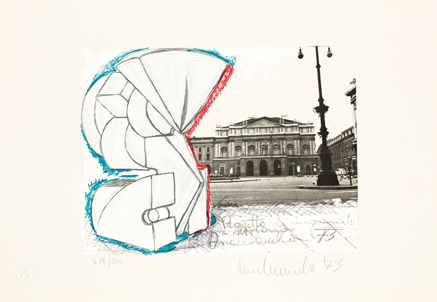 Opera originariamente contenuta all'interno della cartella 'Milano' edita nel 1973 da Giulio Bolaffi e contenente opere di Adami, Baj, Dova, Folon e A. Cascella