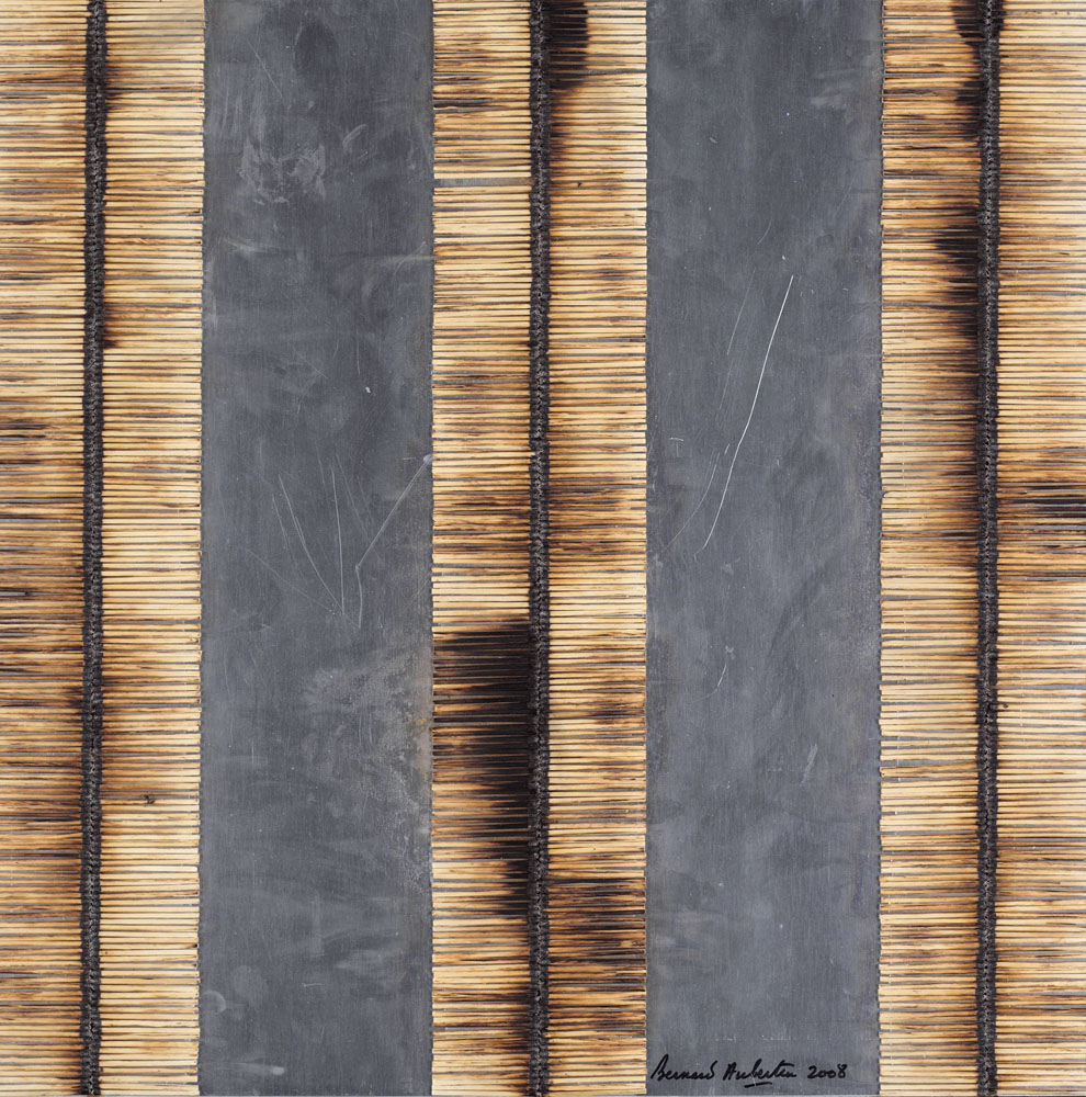 BERNARD AUBERTIN Fontenay aux Roses 1934 Dessin de feu, 2008 fiammiferi e combustioni su alluminio cm. 50x50, firma e anno in basso al centro, dichiarazione d'autenticità dell'artista su foto, pubblicato sul catalogo della mostra "Bernard Aubertin, Fuoco e metallo", tenutasi presso la Galleria Allegrini Arte, pagina 63, entro teca in plexiglass.