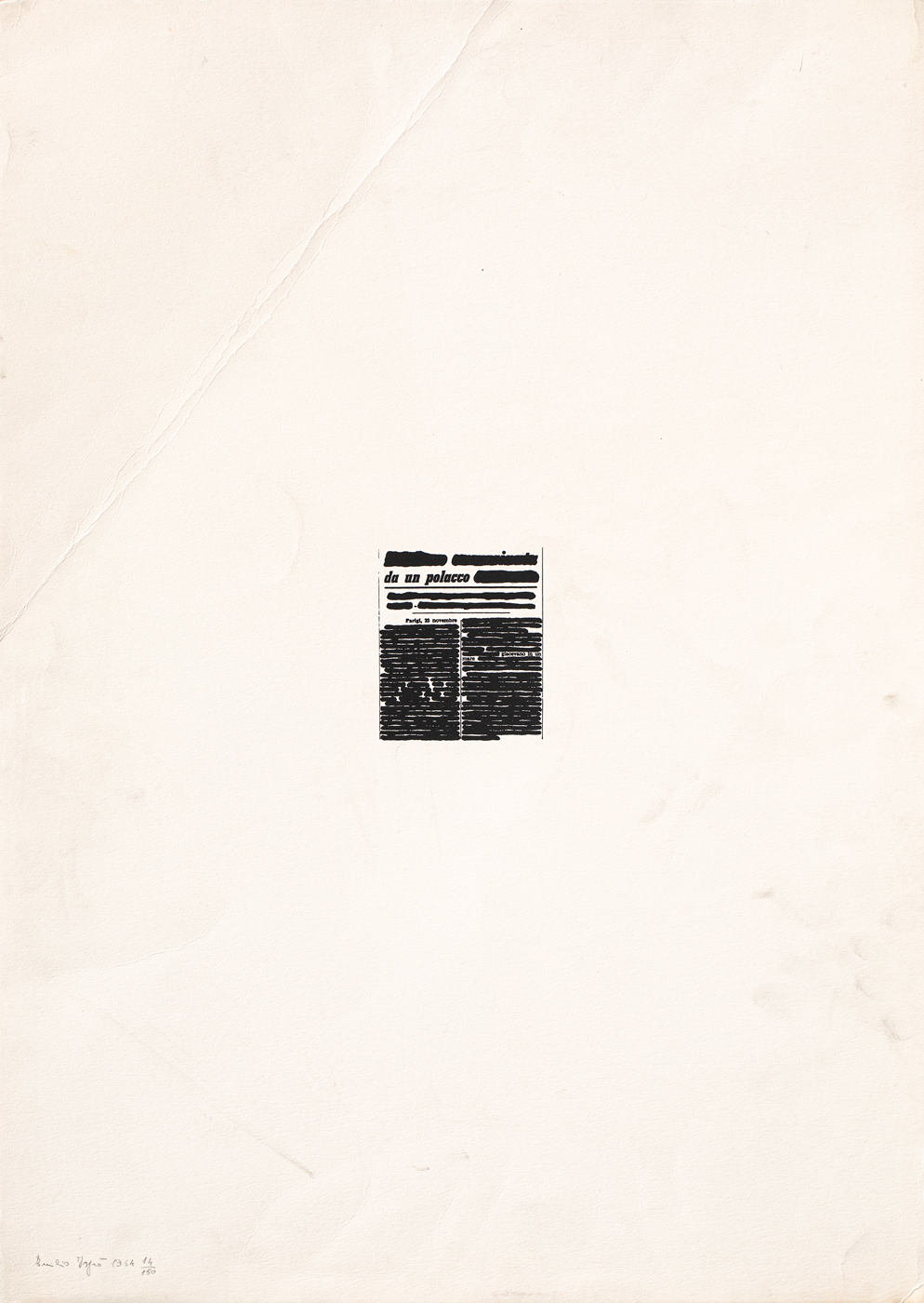 Opera originariamente contenuta all'interno della cartella 'Poesie visive e cancellature', Peruz Editore, Milano