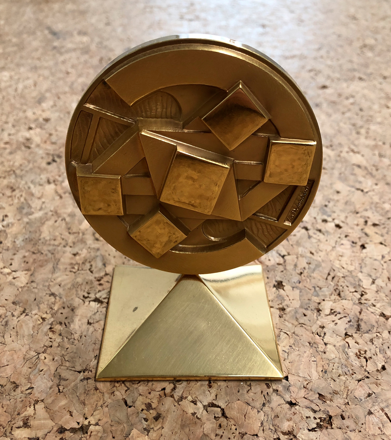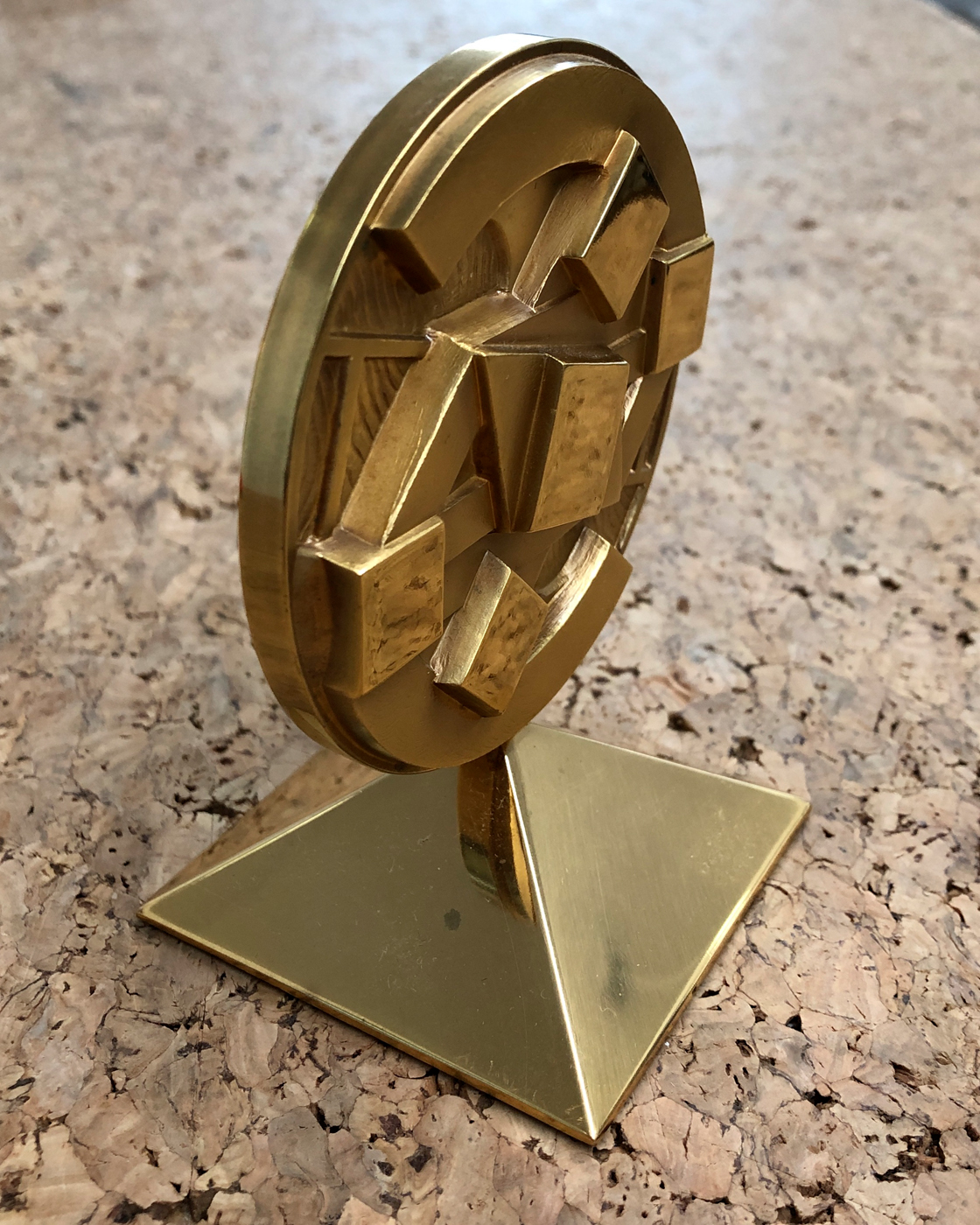 Medaglia in bronzo dorato poggiante su base in bronzo dorato
