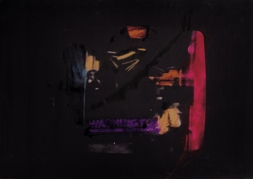 MARIO SCHIFANO Homs (Libia) 1934 - Roma 26/01/1998 Paesaggio tv, prima metà anni '70 emulsione su tela cm. 80x115, firma al retro, opera rgistrata presso l'archivio Mario Schifano come da dichiarazione su foto, entro teca in plexiglass originale.