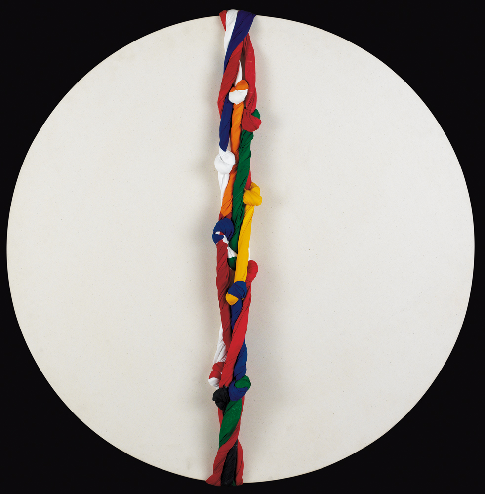 JORGE EIELSON Perù 1924 - Milano 09/03/2006 Bandiere, 2004 (1998) tele annodate e acrilici su tela applicata su tavola circolare cm. 100, firma, titolo e anni al retro, opera registrata presso l'Archivio Jorge Eielson al numero JE 438 come da dichiarazione su foto, opera priva di cornice.