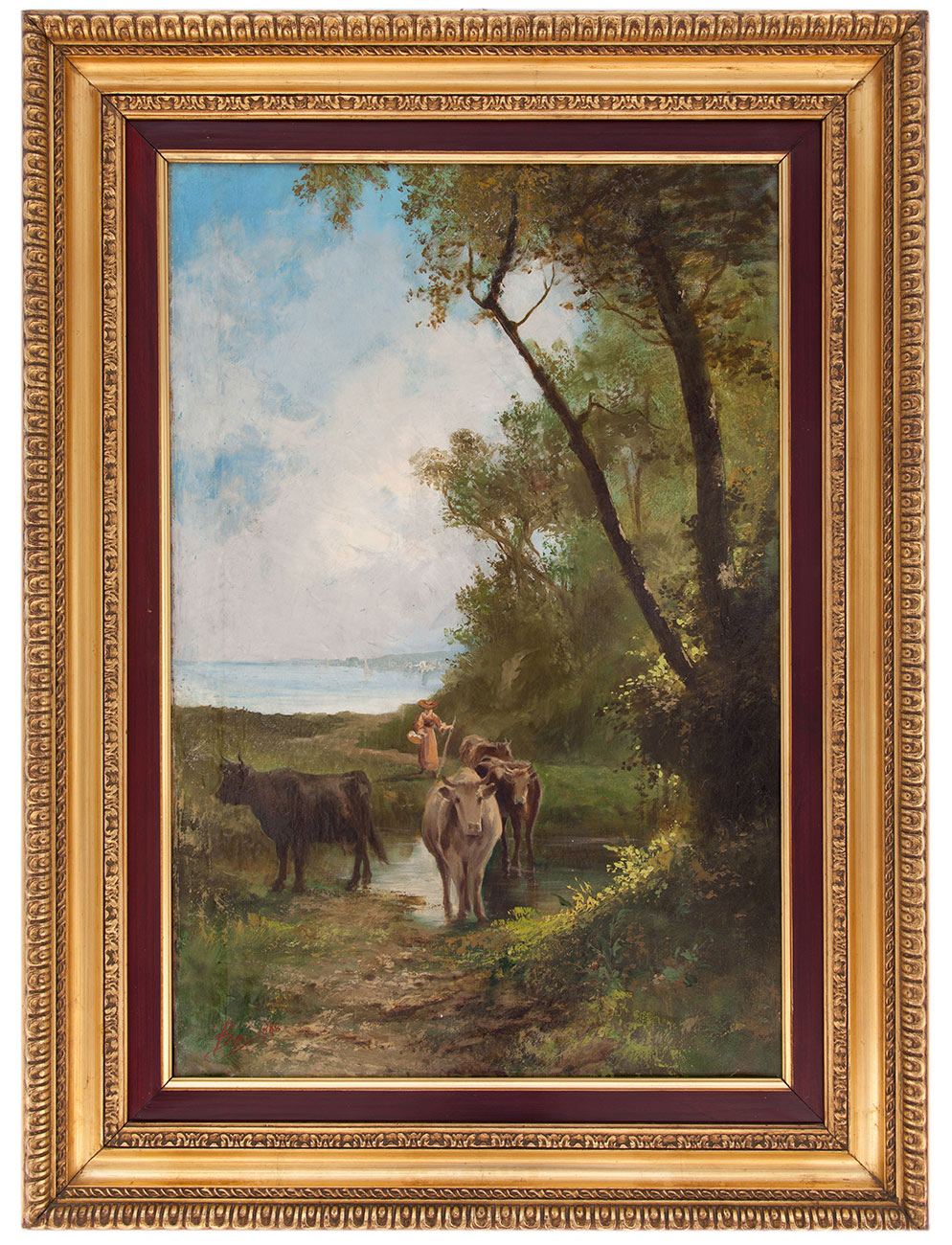 Giacinto Bo Montanaro Canavese (TO) 1832 - Torino 1912 Paesaggio costiero con armenti Olio su tela cm 71x47