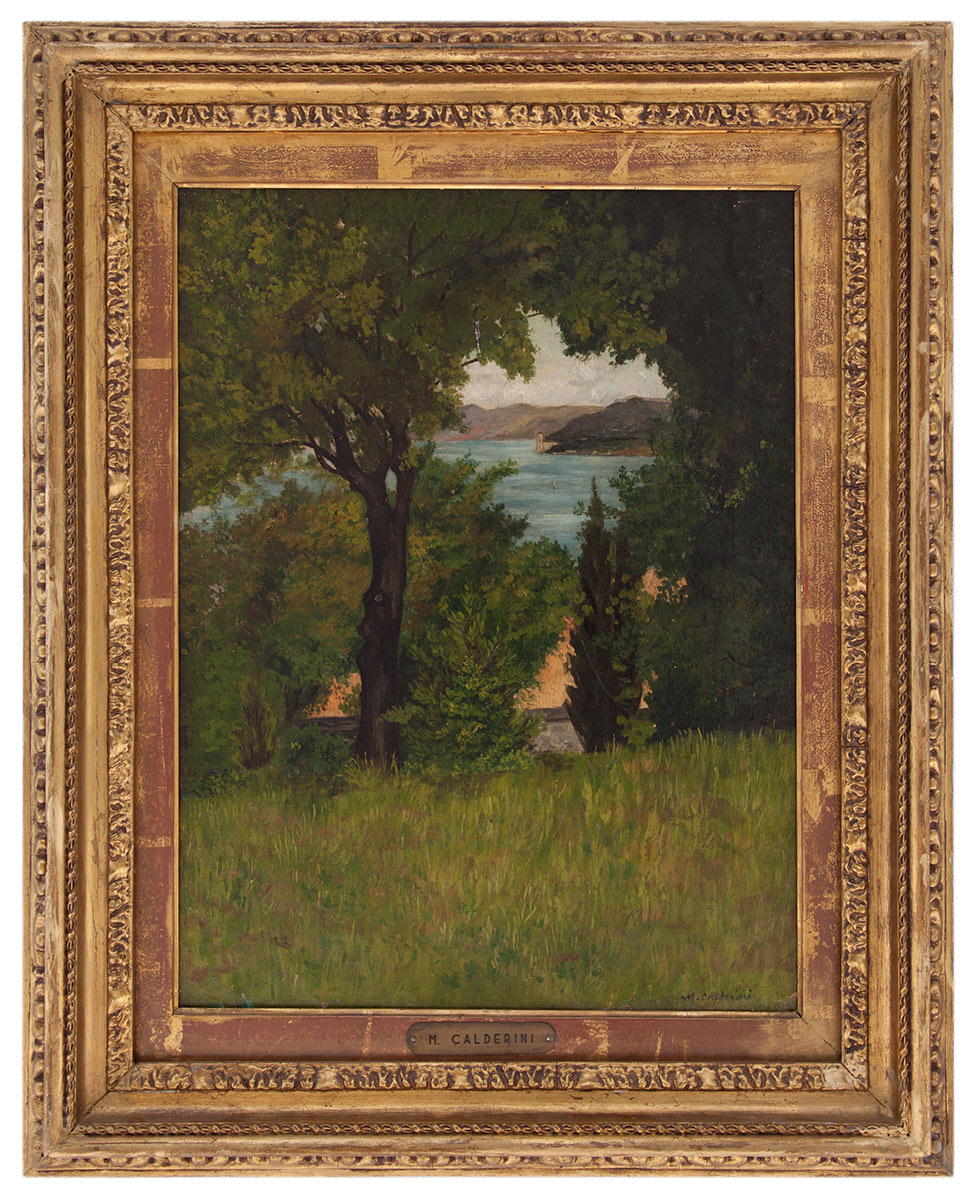 Marco Calderini Torino 1850 – 1941 Veduta Lacustre olio su tela cm 54x41