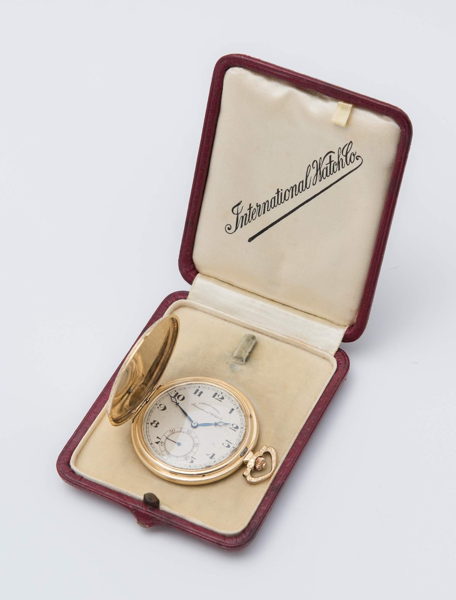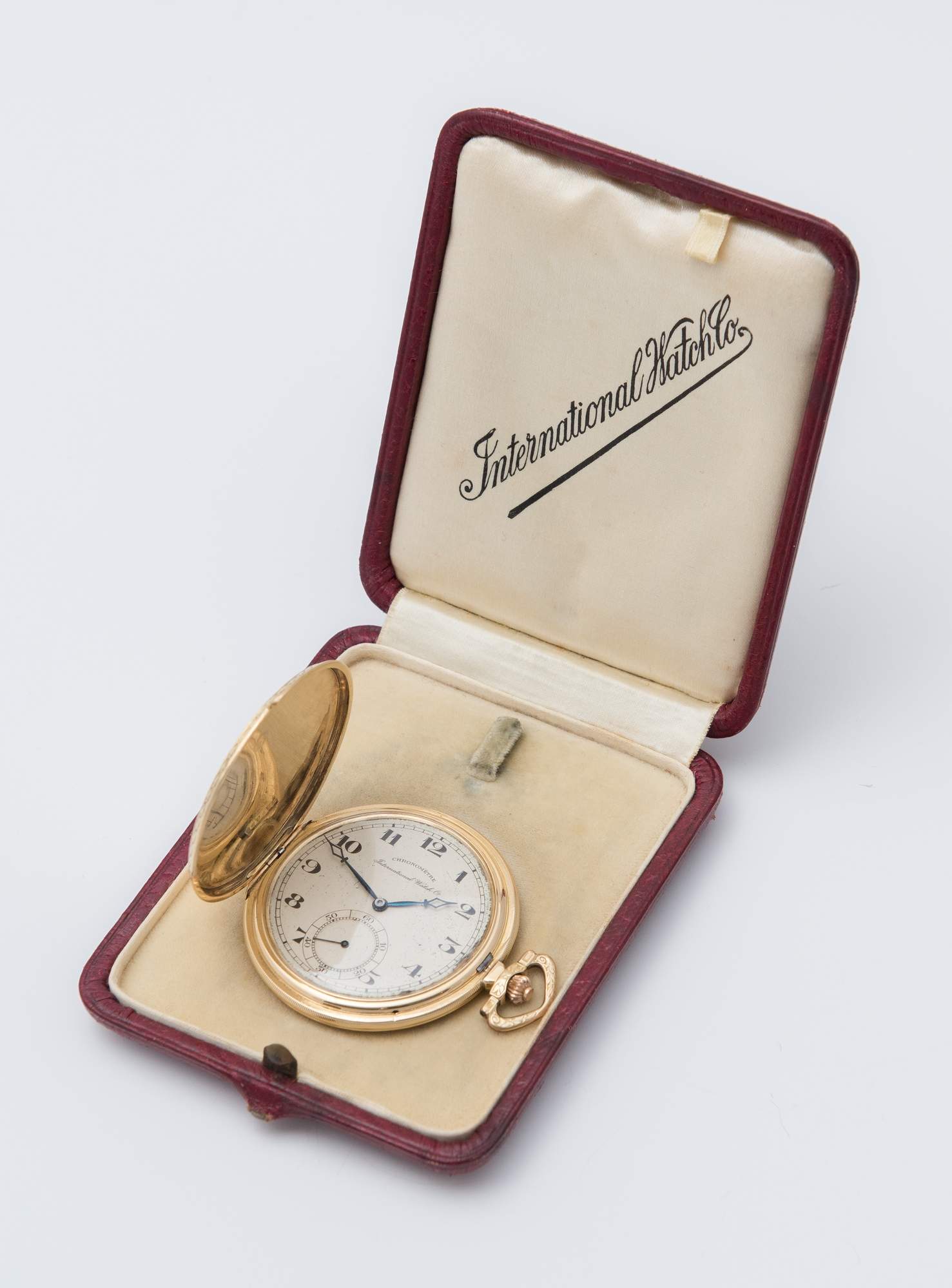 OROLOGIO DA TASCA IWC Cassa savonnette in oro giallo 18K, corona di carica a ore 3, quadrante marcato “International Watch Co” in smalto bianco con ore in numeri arabi neri, piccoli secondi a ore 6. Movimento a carica manuale firmato. Entro astuccio originale; si consiglia revisione. Peso complessivo: 71 grammi.