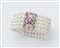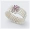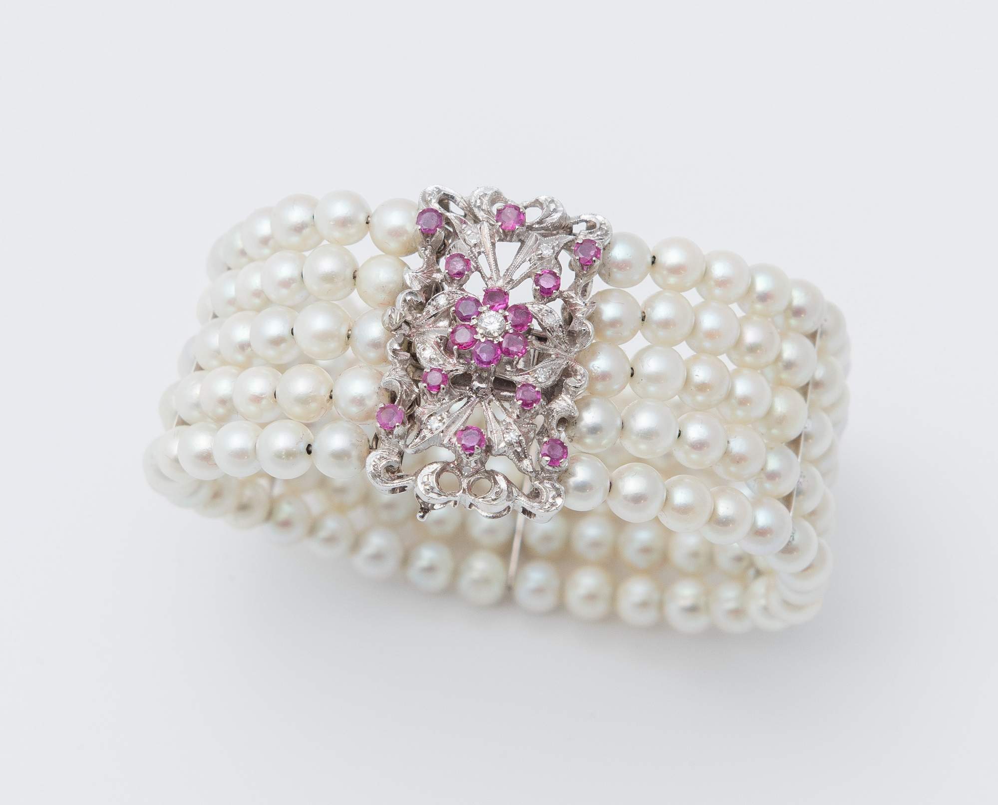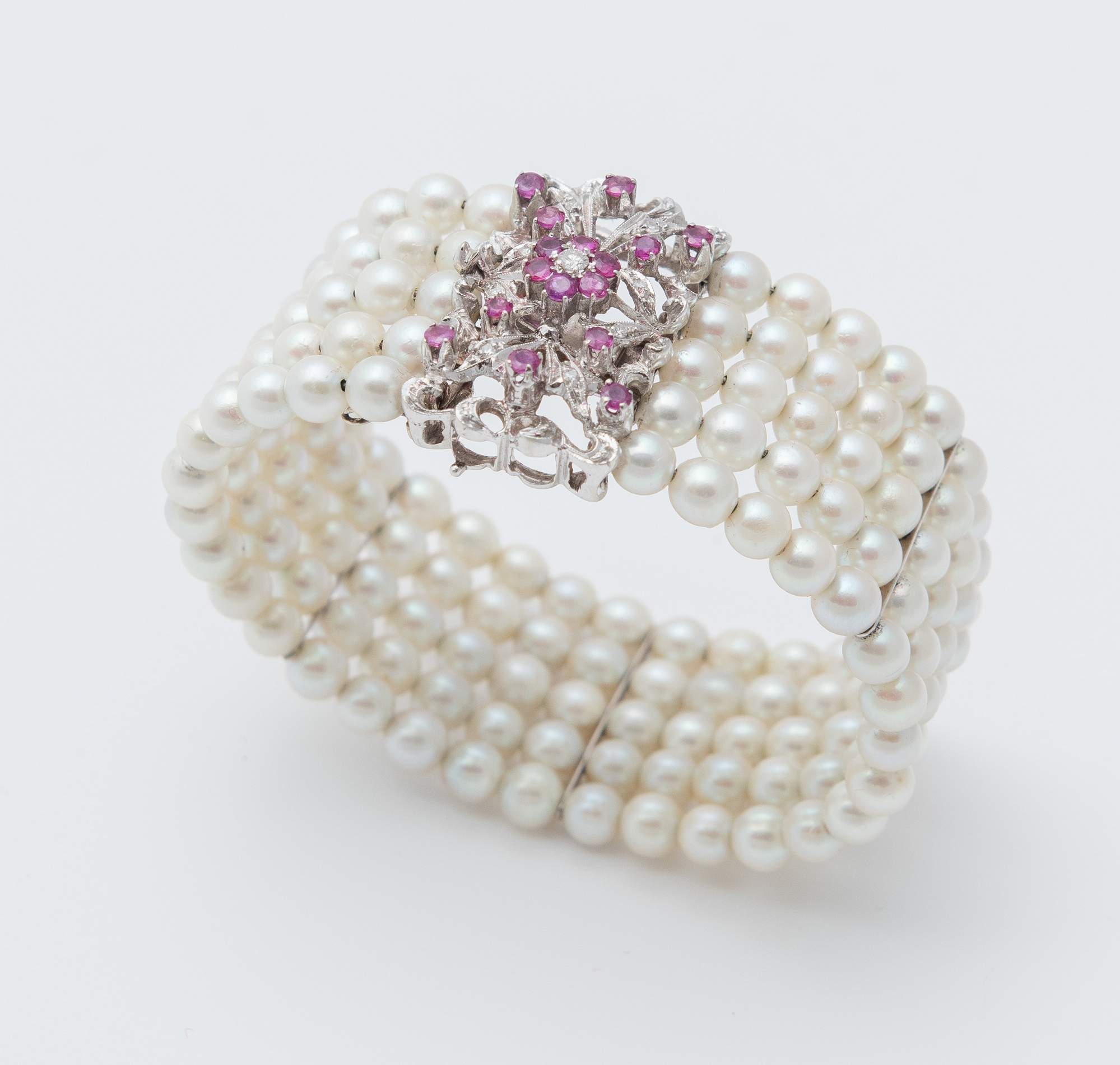 BRACCIALE RIGIDO DI PERLE realizzato a 5 fili di perle coltivate di 5,5 mm di diametro, centrato da fermezza in oro bianco decorata con piccoli rubini e diamanti. Peso complessivo 56,92 grammi.