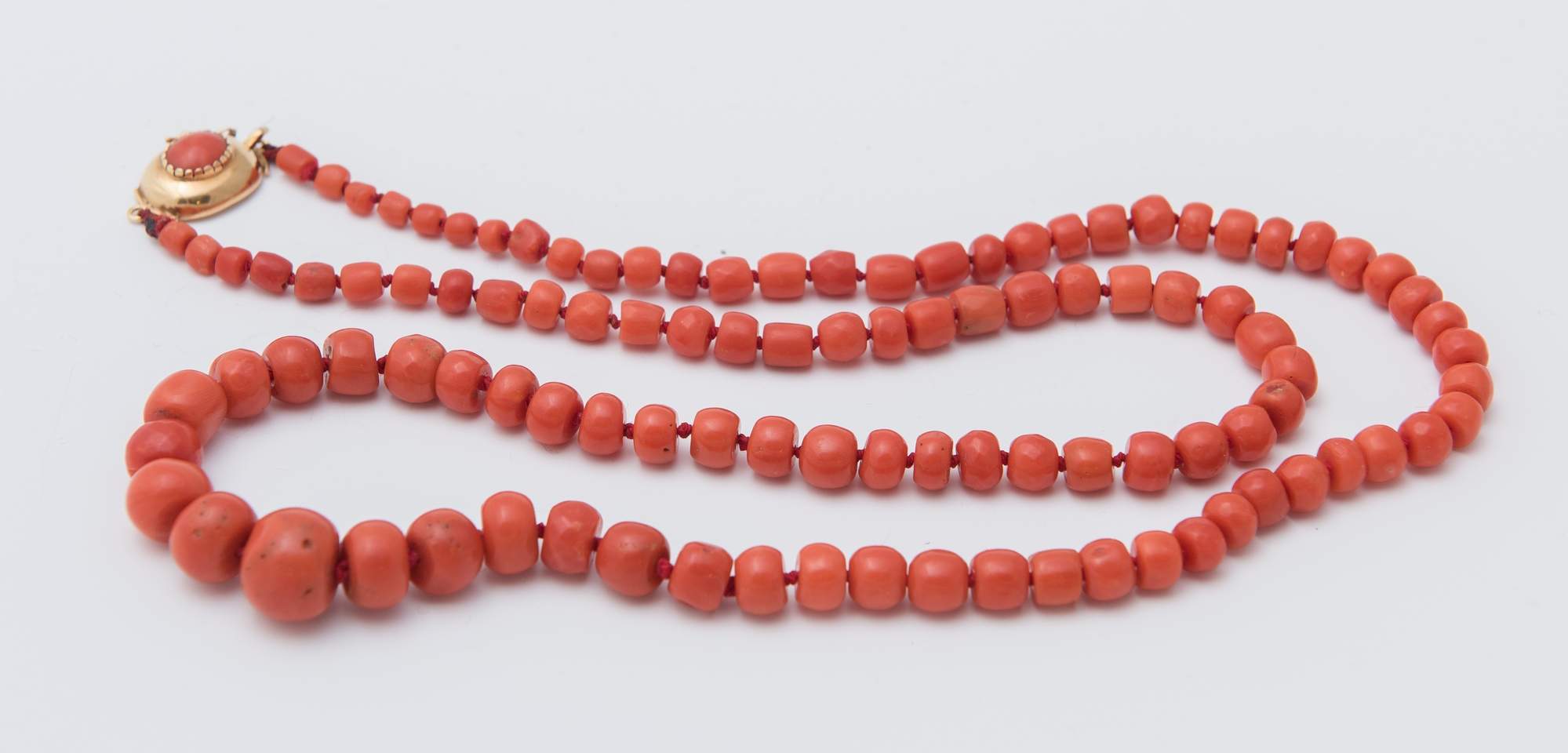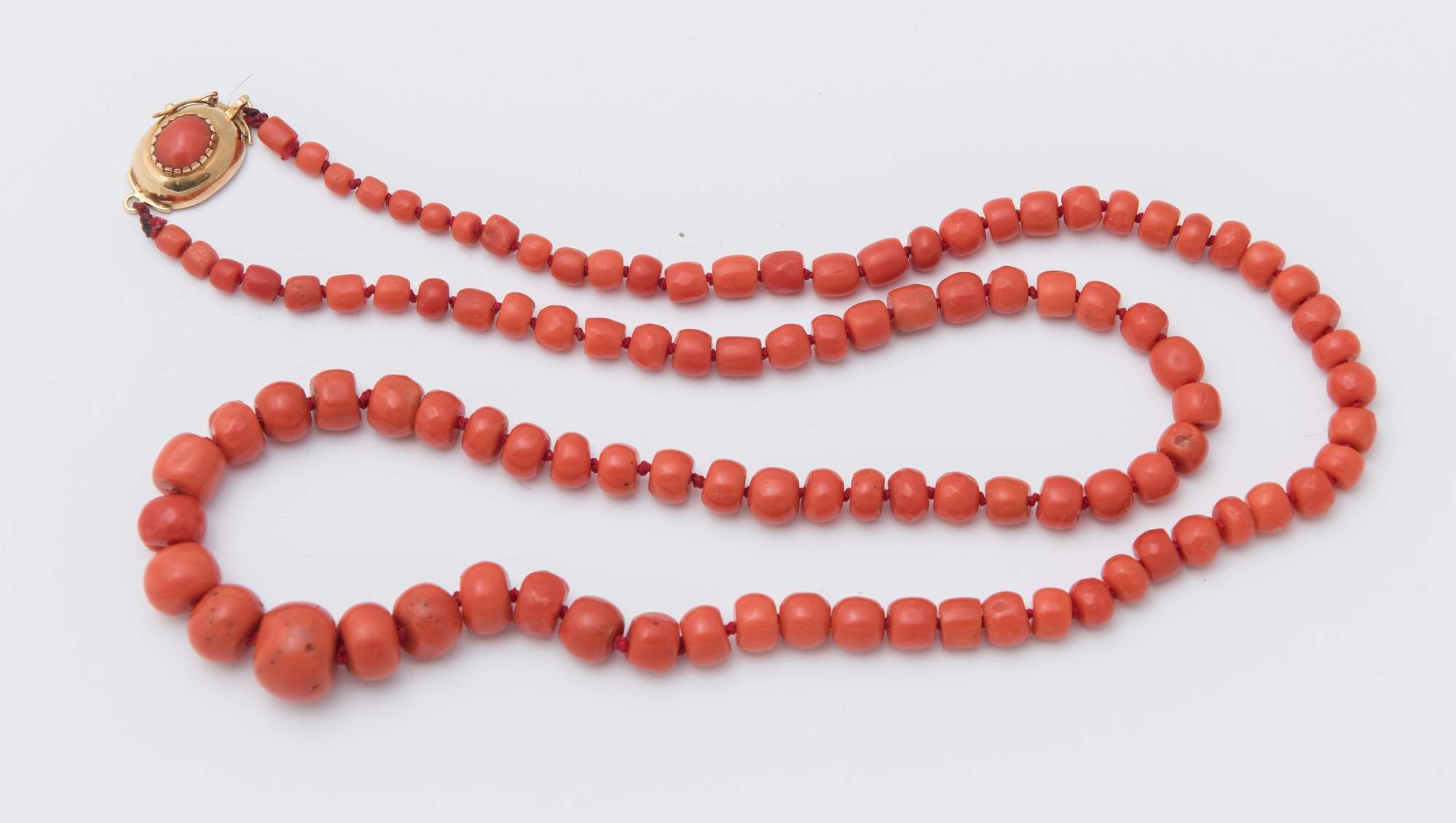 COLLANA IN ORO E CORALLI ad una fila di barilotti digradanti di corallo rosso-arancio, diametri da 4.5 a 14.5 mm; fermezza in oro 18K centrata da cabochon di corallo. Peso complessivo 64,62 grammi.