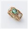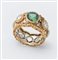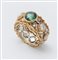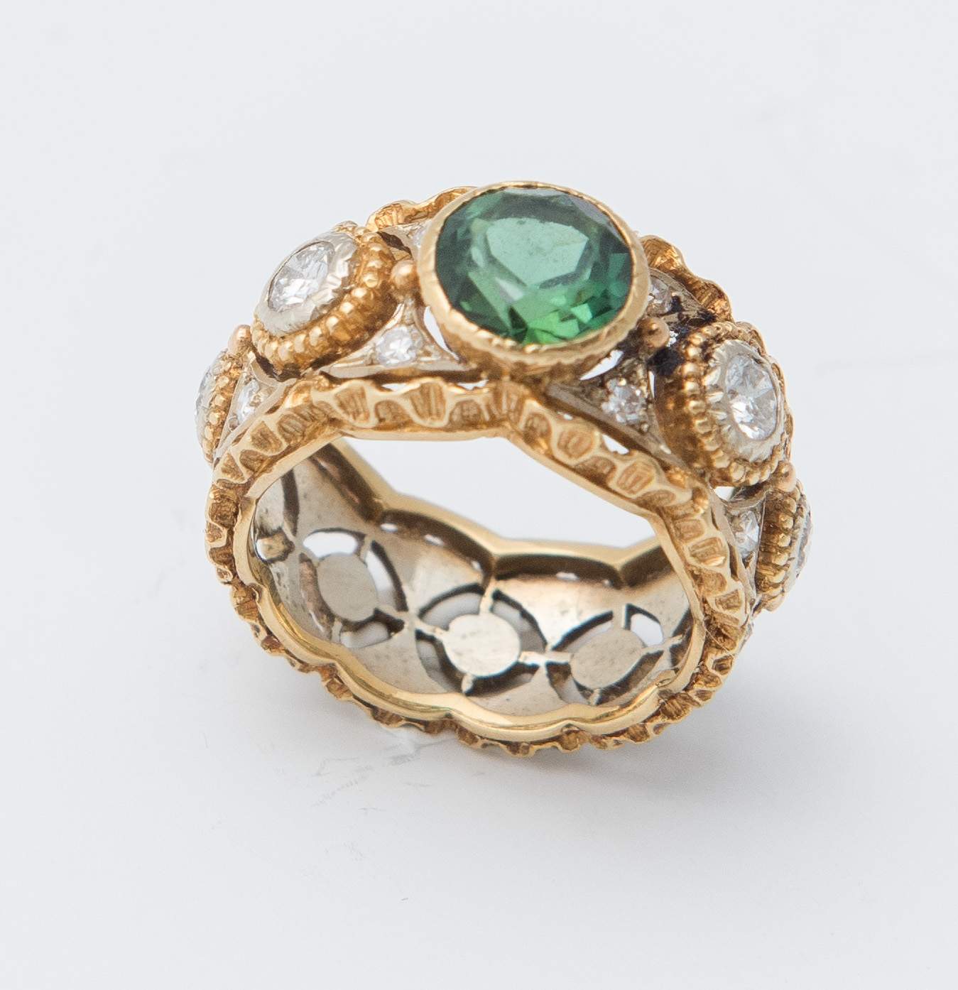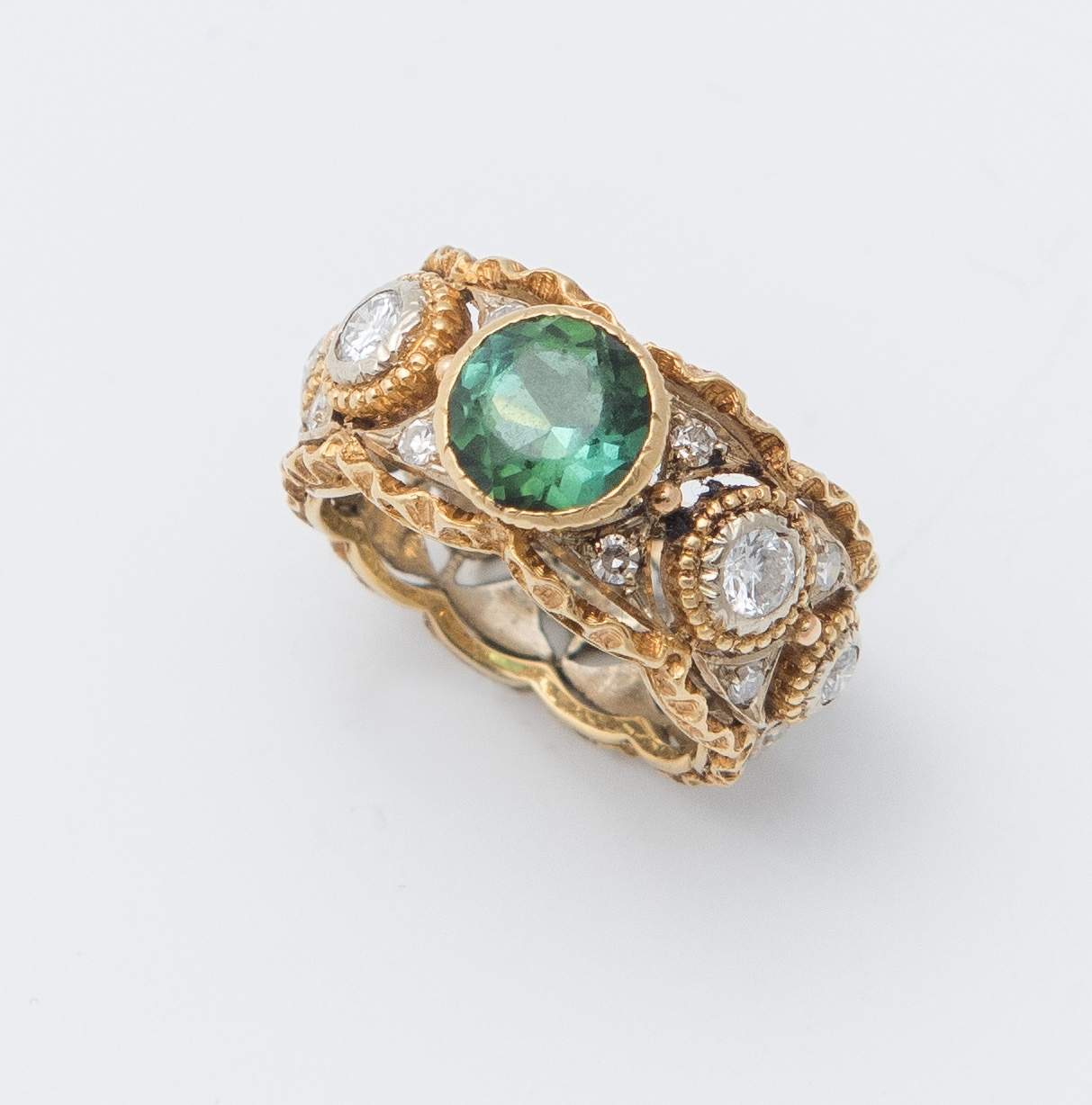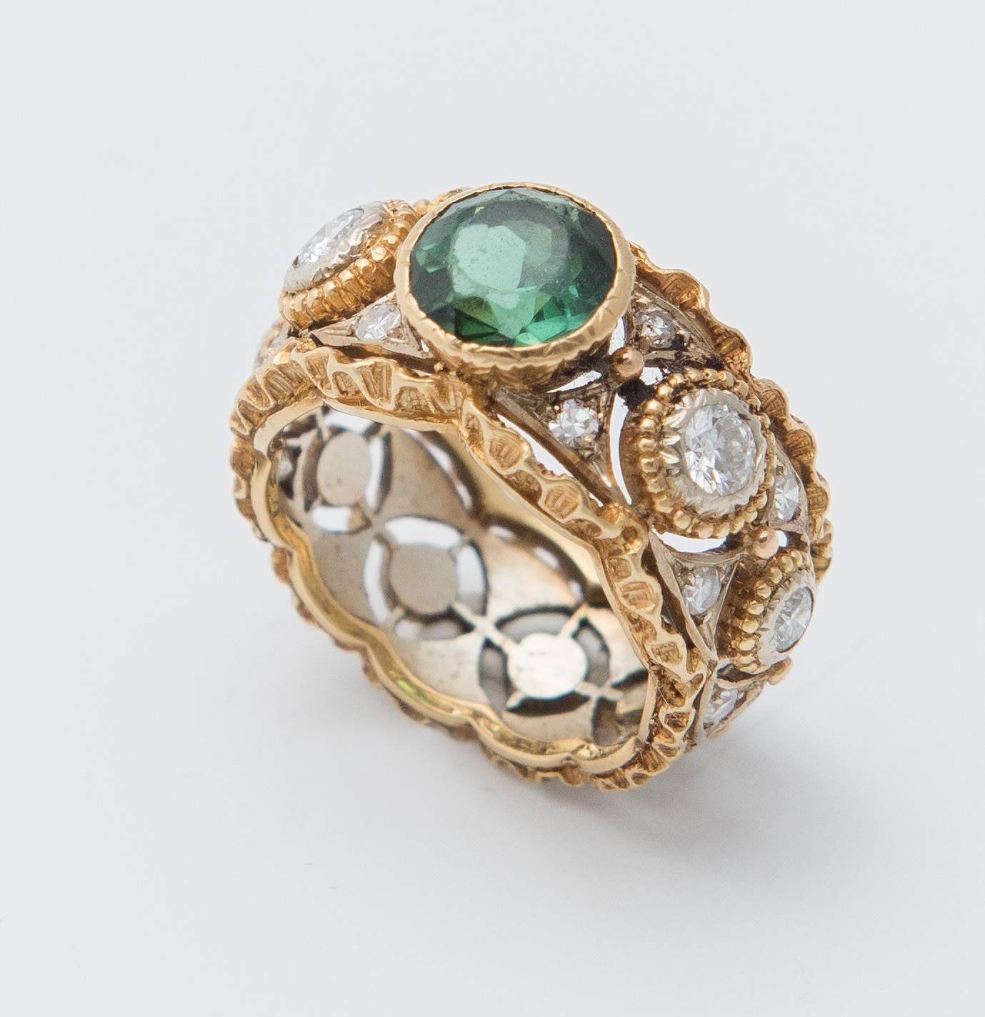 ANELLO IN ORO, TORMALINA E DIAMANTI realizzata come una fascia in oro giallo e bianco traforata e cesellata, decorata con tormalina verde e diamanti per un peso complessivo stimato di 0,50 ct. Peso complessivo 6,89 grammi