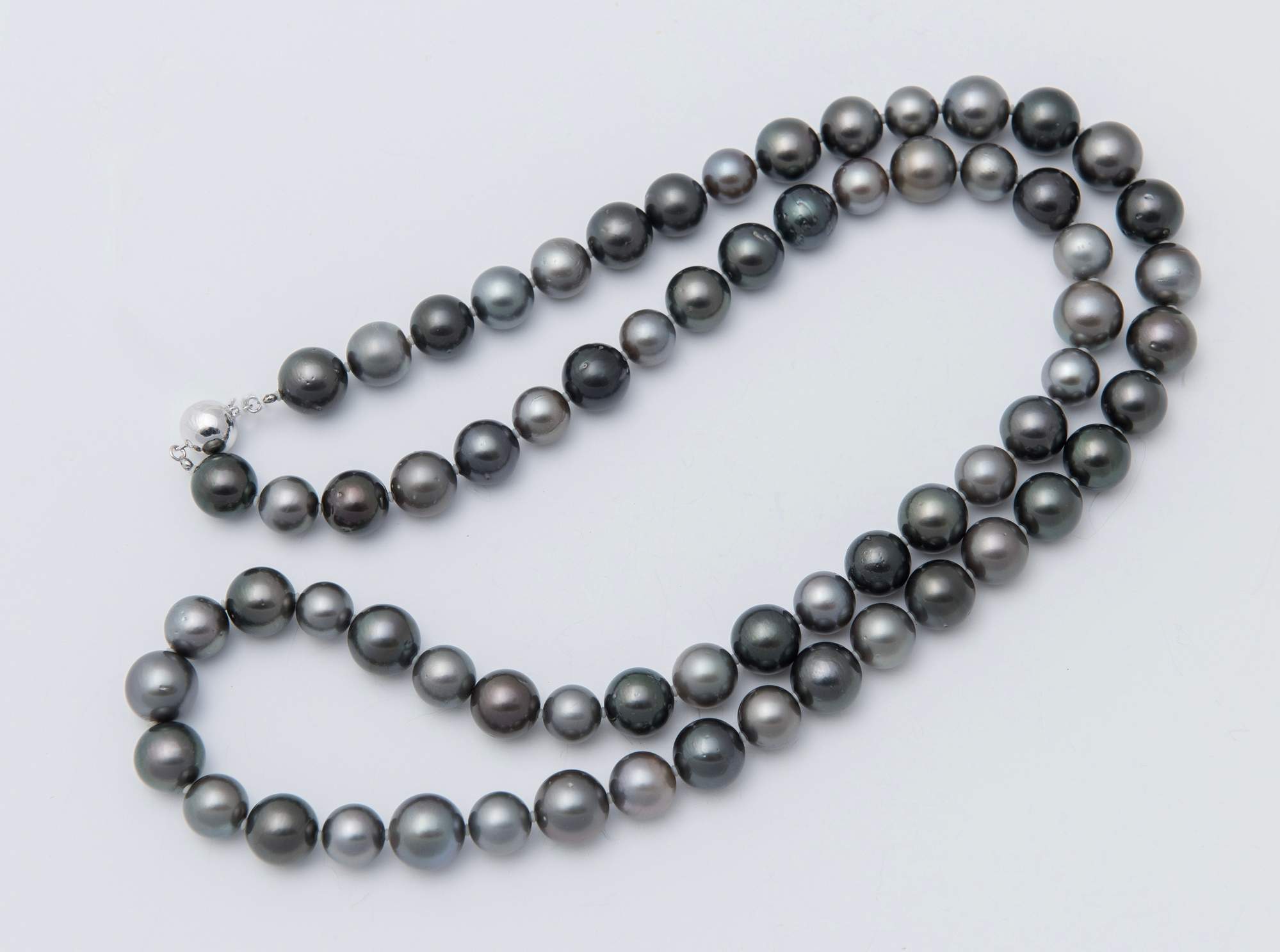 COLLANA IN PERLE NERE DI TAHITI. Lunga collana ad un filo di perle nere sferiche di Tahiti, diametri da mm 10 a 12 ½; fermezza a boule in oro bianco 18K, lunghezza cm 80.