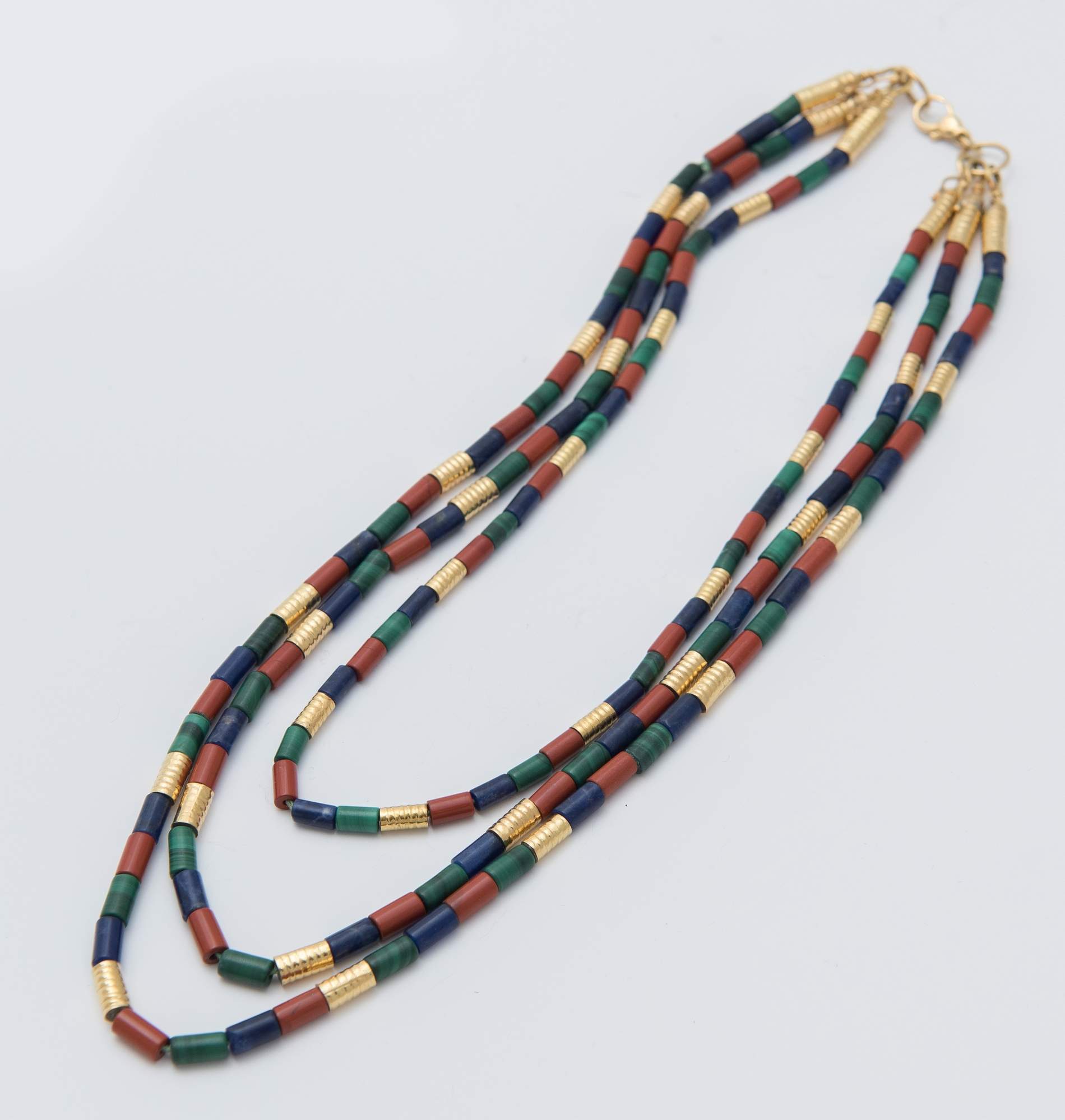 COLLANA IN ORO E PIETRE DURE realizzata a tre fili di barilotti di corniola, lapislazzuli e malachite, con inserti ricoperti in oro giallo 18K. Peso complessivo 65,87 grammi.