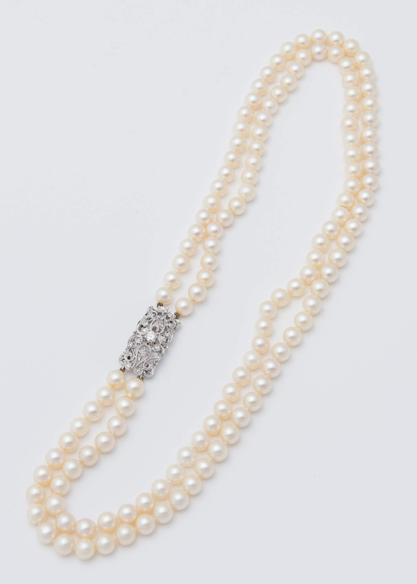 COLLANA A DUE FILI DI PERLE COLTIVATE realizzata a due fili di perle coltivate sferiche, di acqua salata, diametro 8 – 8 ½, con fermezza in oro bianco 18K decorata con diamanti. Un diamante centrale del peso stimato di 0.35 ct e numerosi piccoli diamanti huit-huit. Peso complessivo: 110,92 grammi.