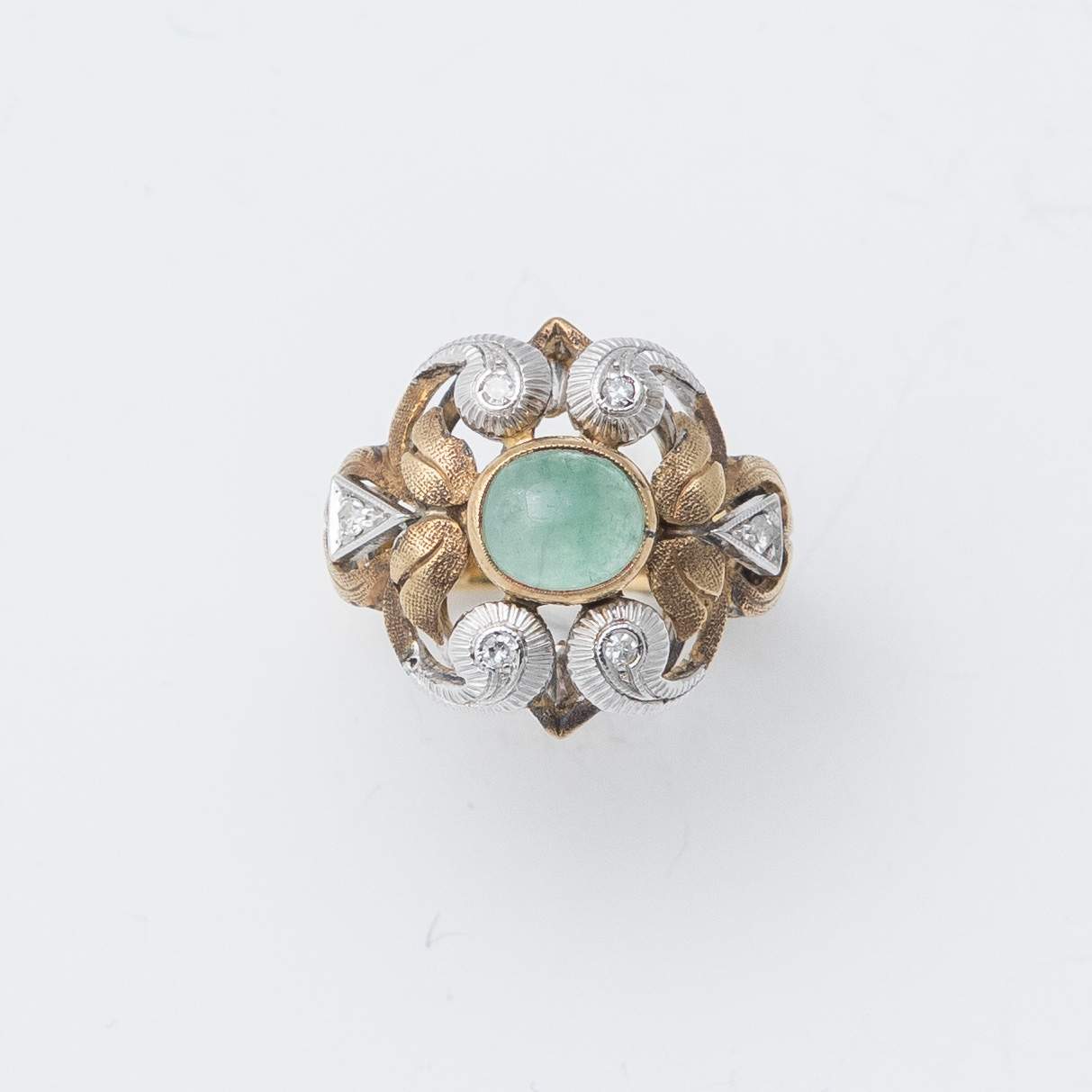 ANELLO CON SMERALDO E DIAMANTI en suite al bracciale-orologio lotto 49. Realizzato in oro giallo e bianco 18K, con smeraldo cabochon entro cornice di piccoli diamanti di taglio singolo. Peso complessivo 6,77 grammi.