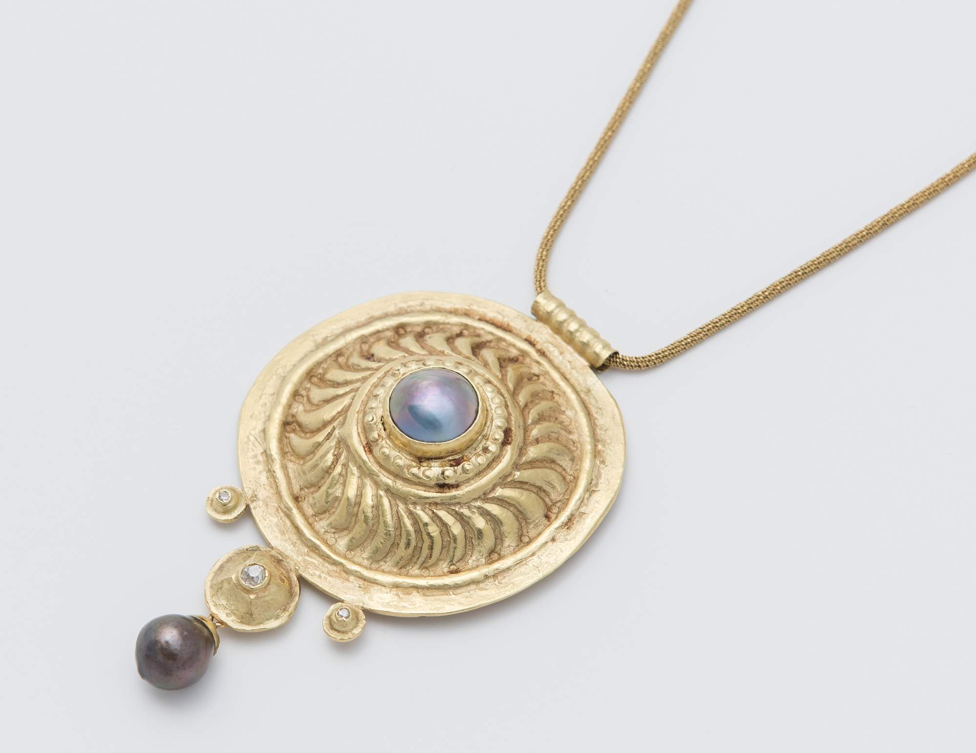 COLLANA IN ORO GIALLO, DIAMANTI E PERLE con catena sottile e grande pendente centrale decorato con perla grigia, perla mabé e tre diamanti di vecchio taglio. Peso complessivo 38,22 grammi. Gioiello ad opera dell'artista Francesco Brunetti. Gioiello esposto nella mostra "Il racconto della materia", Palazzo Garagnani, Crespellano di Valsamoggia, 22 settembre - 23 ottobre 2016. Gioiello pubblicato nel catalogo "Francesco Brunetti, il racconto della materia", 2016, pag. 80.