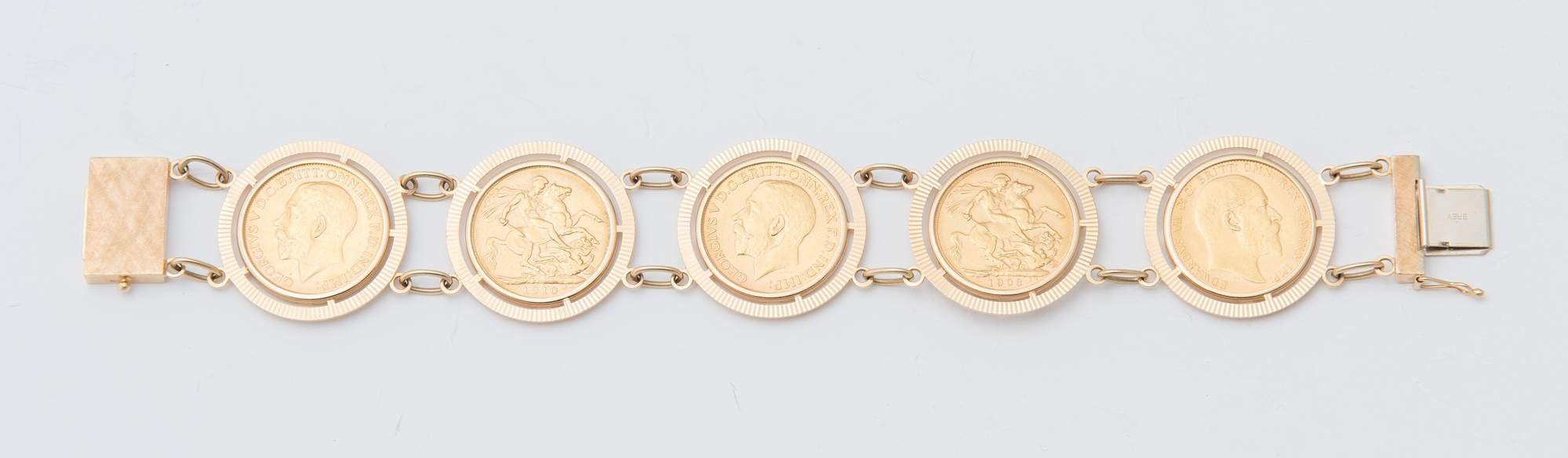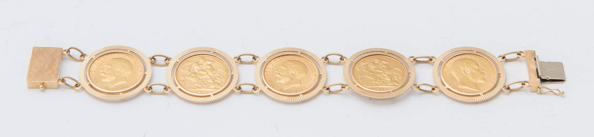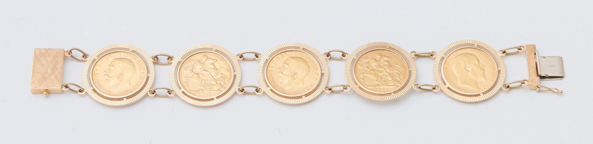 BRACCIALE CON STERLINE IN ORO 18K ad una fila di cinque sterline in oro intercalate da maglie ovali in oro 18K. Le sterline sono datate rispettivamente 1910, 1903, 1913, 1910, 1918. Peso complessivo: 64,20 grammi.