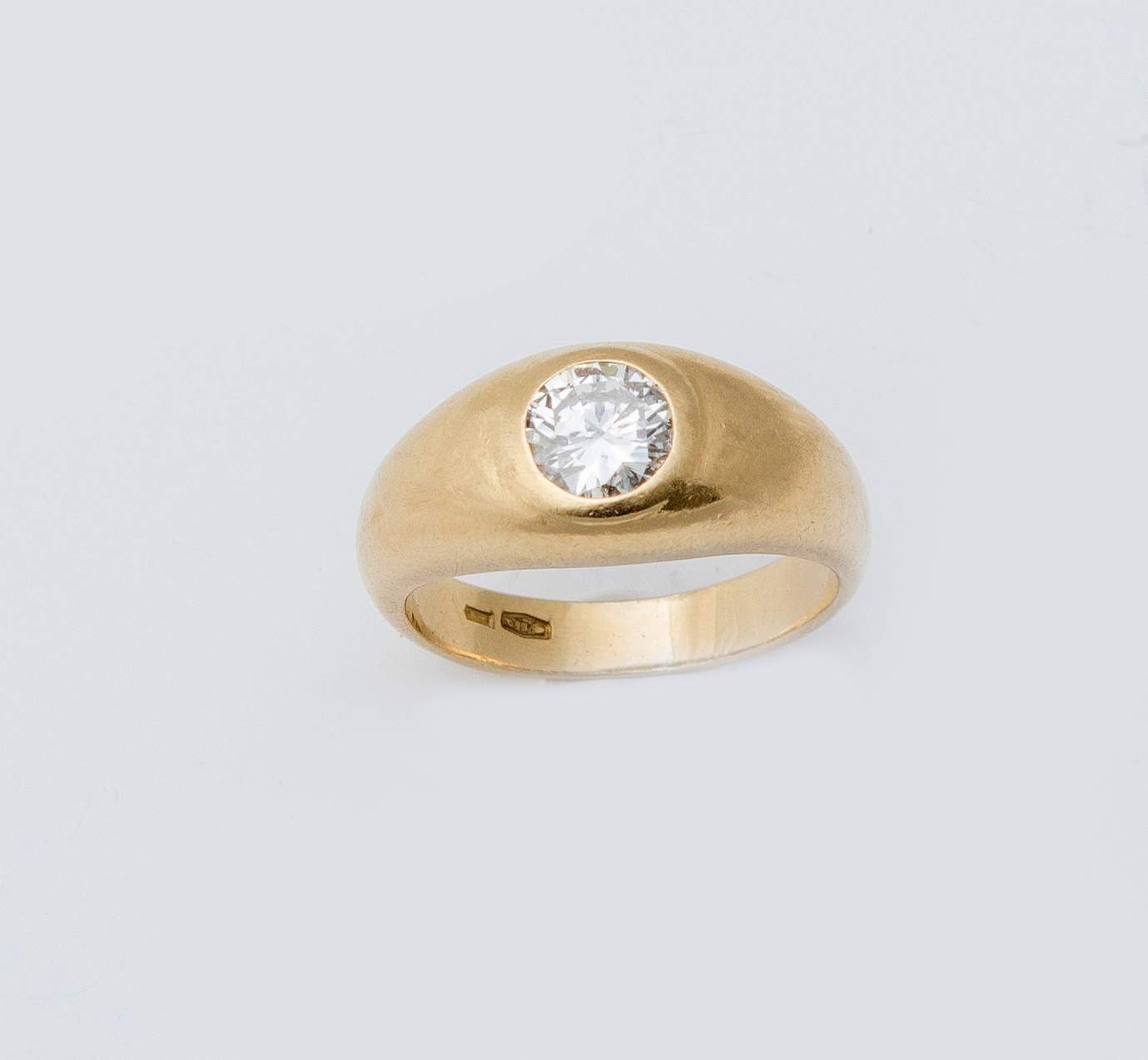 ANELLO MASCHILE CON DIAMANTE SOLITARIO in oro giallo 18K, centrato da diamante a brillante rotondo del peso di 1,25 ct, colore G, purezza P2, allegata verifica gemmologica. Peso complessivo: 12,70 grammi.