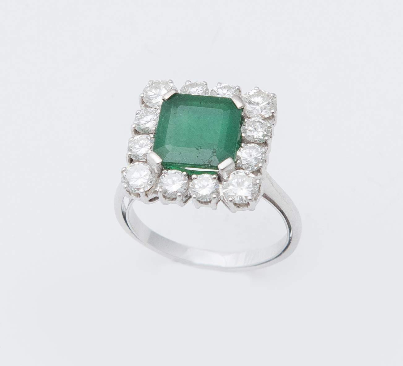 ANELLO CON SMERALDO E DIAMANTI In oro bianco 18K, con smeraldo ottagonale entro cornice di brillanti. Smeraldo del peso indicativo stimato di 2.70 ct e diamanti per 2 ct. Peso complessivo: 6 grammi.