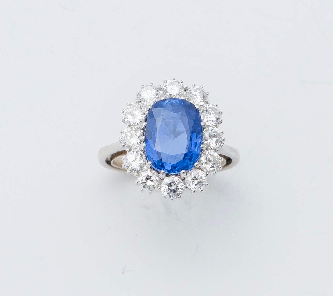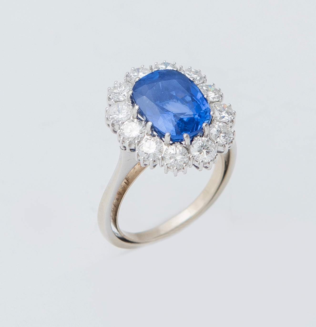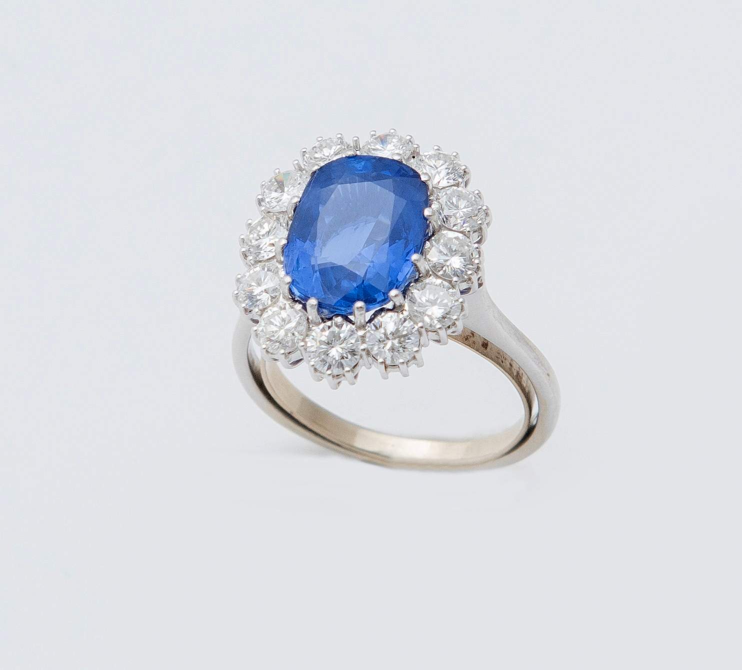 ANELLO CON ZAFFIRO E DIAMANTI in oro bianco 18K, con zaffiro naturale entro cornice di dodici brillanti (1,65 ct circa). Zaffiro del peso stimato di 4,25 ct, privo di trattamenti e indicativo di origine Sri Lanka (Ceylon). Allegata analisi gemmologica. Peso complessivo: 6,05 grammi.