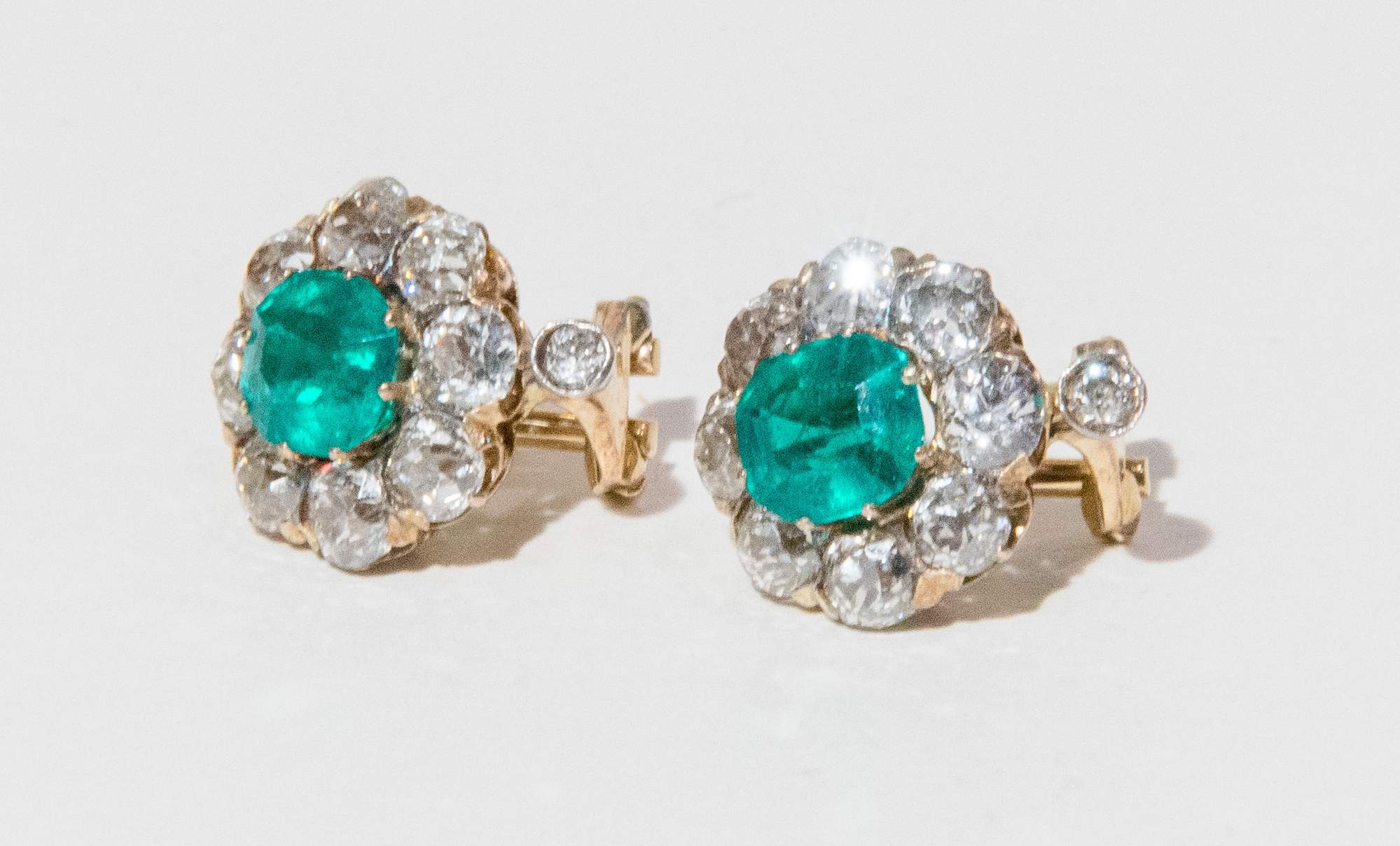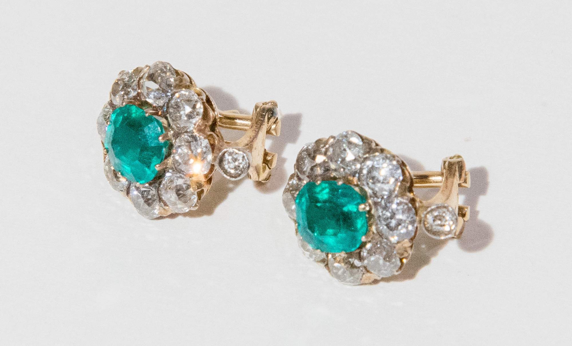 ORECCHINI IN ORO 18K CON SMERALDI E DIAMANTI ciascuno realizzato come una clip centrata da smeraldo colombiano ottagonale posto entro cornice diamanti di vecchio taglio; peso stimato degli smeraldi 2.50 ct circa, peso stimato dei diamanti 3.40 ct circa. Peso complessivo: 7,10 grammi.
