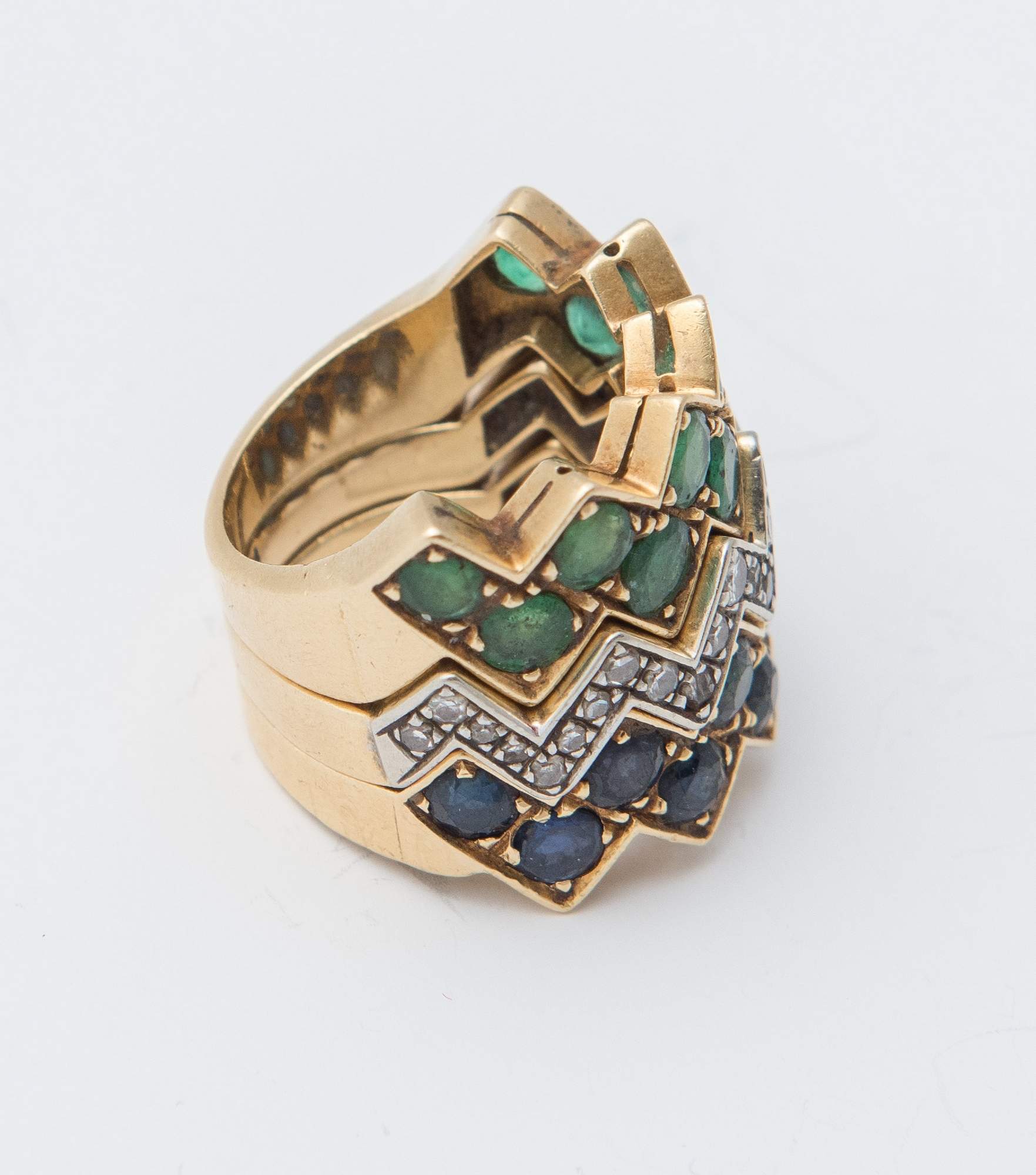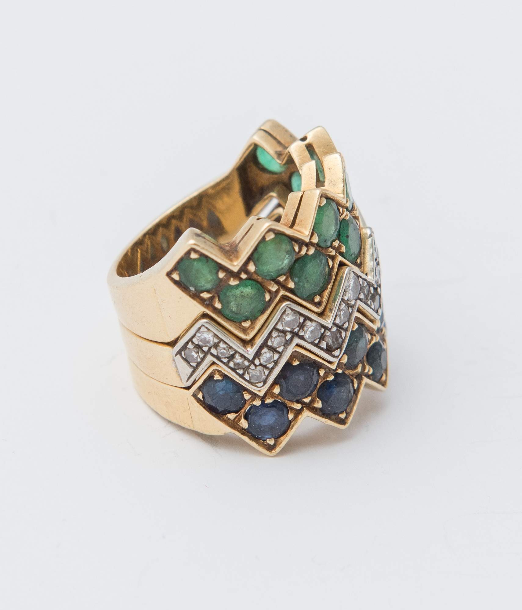 TRE ANELLI CON DIAMANTI, ZAFFIRI E SMERALDI in oro 18K, ciascuno realizzato...