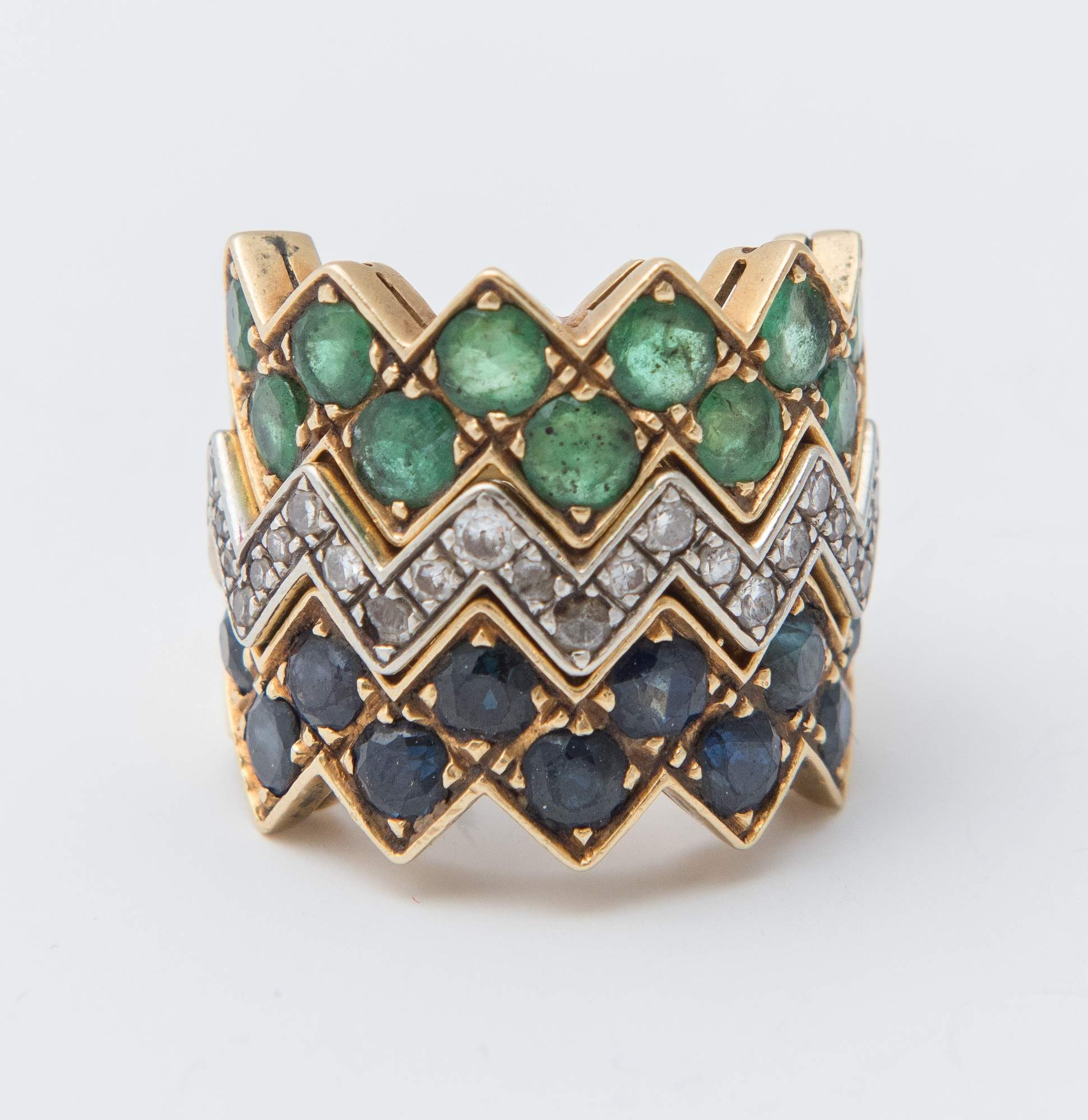 TRE ANELLI CON DIAMANTI, ZAFFIRI E SMERALDI in oro 18K, ciascuno realizzato con motivo a greca, decorati rispettivamente con zaffiri, smeraldi e piccoli diamanti. Peso indicativo dei diamanti 0.55 ct. Peso complessivo 25,96 grammi.
