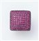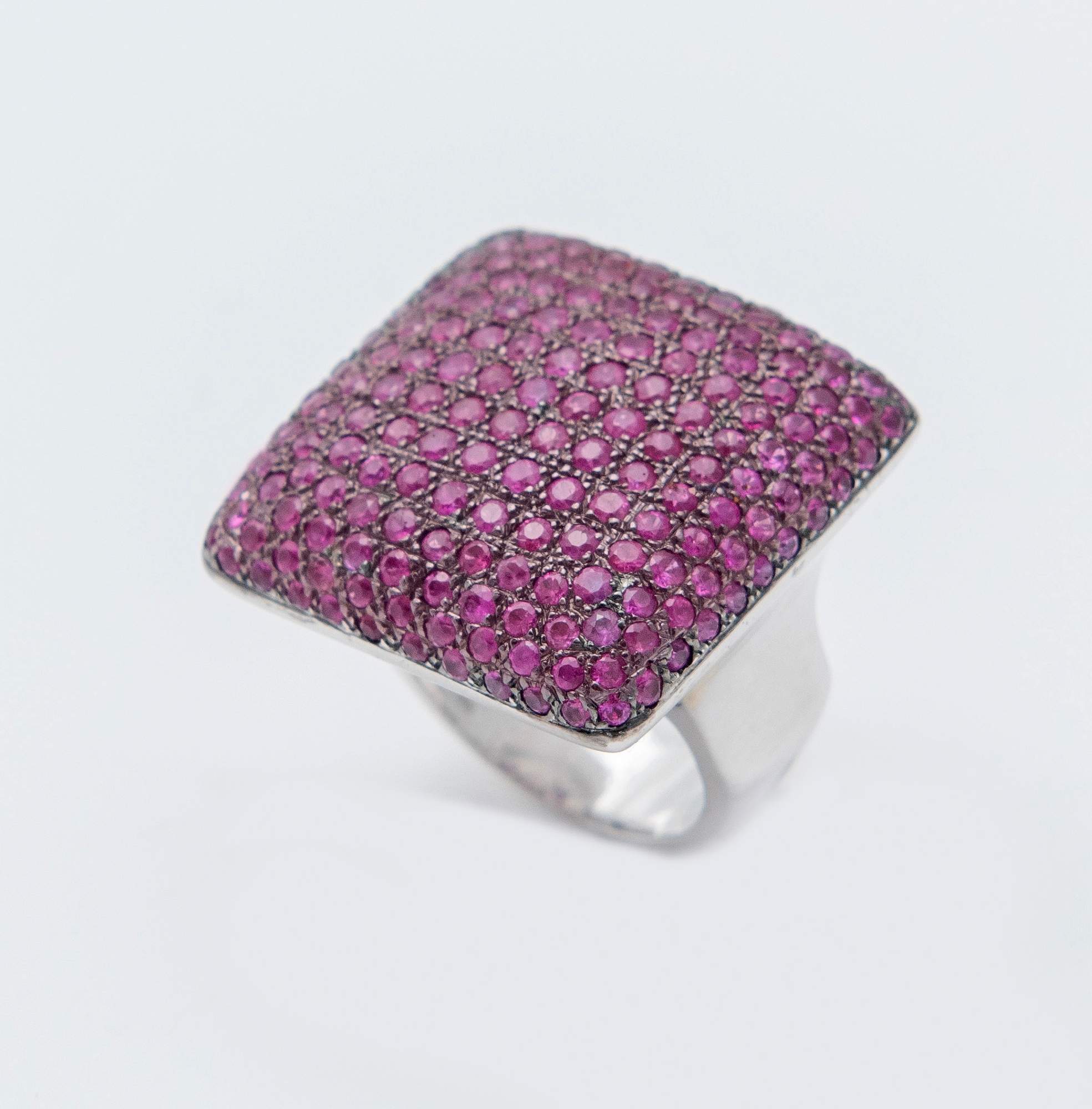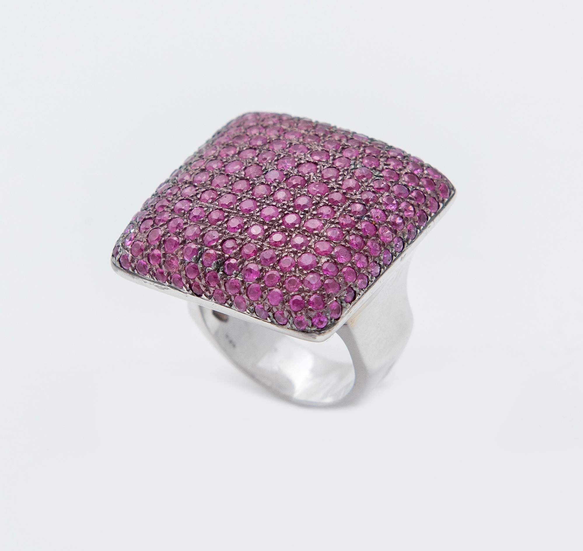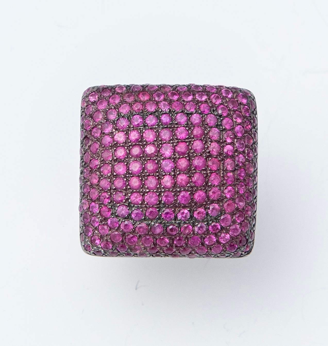 GRANDE ANELLO CON RUBINI in oro bianco 18K, cupola in oro brunito fittamente decorata a pavé di rubini rotondi. Peso complessivo 26,25 grammi.