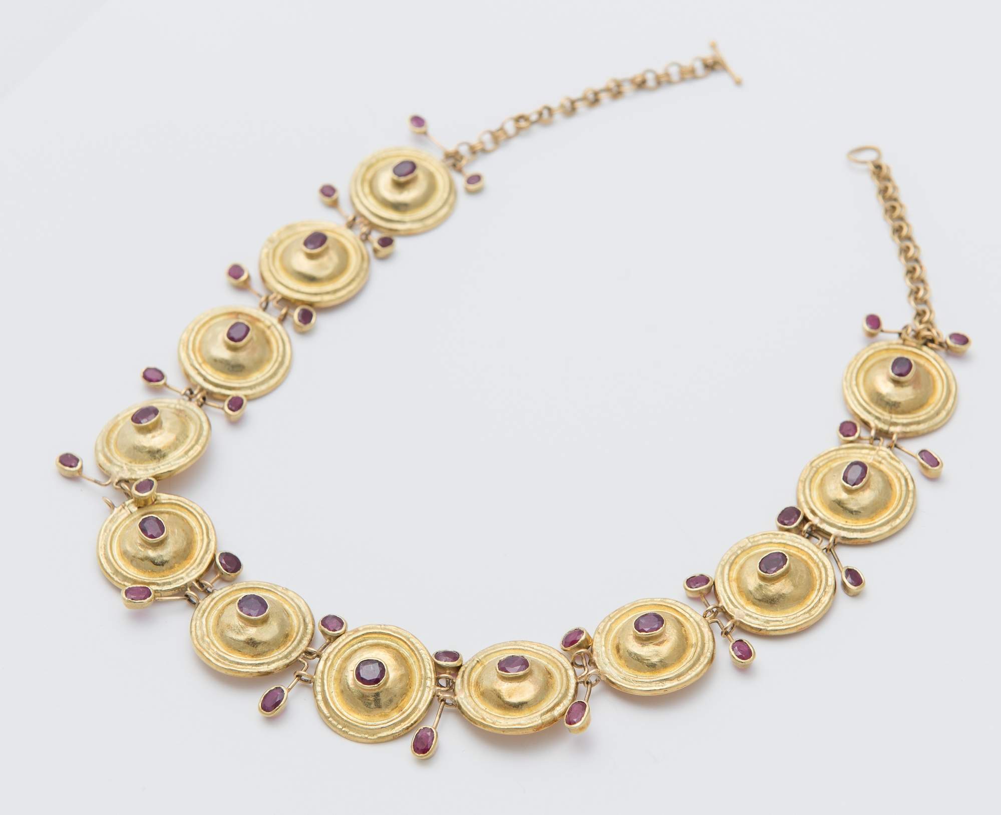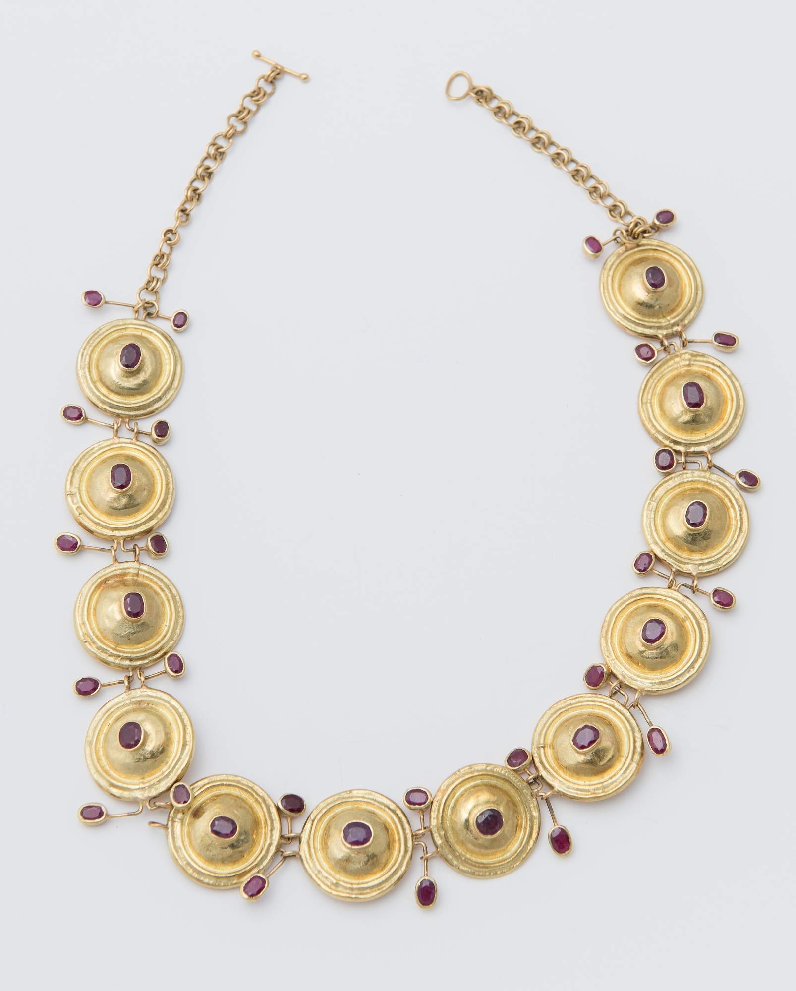 COLLANA IN ORO E RUBINI in oro giallo 18K, realizzata a una fila di formelle sbalzate di forma circolare decorate e intercalate da piccoli rubini sfaccettati di forma ovale. Peso complessivo 80,38 grammi. Gioiello intitolato "Levata di scudi". Gioiello firmato e datato al retro Brunetti Francesco 82/83. Gioiello esposto nella mostra "Il racconto della materia", Palazzo Garagnani, Crespellano di Valsamoggia, 22 settembre - 23 ottobre 2016. Gioiello pubblicato nel catalogo "Francesco Brunetti, il racconto della materia", 2016, pag. 88 (insieme al bozzetto preparatorio).