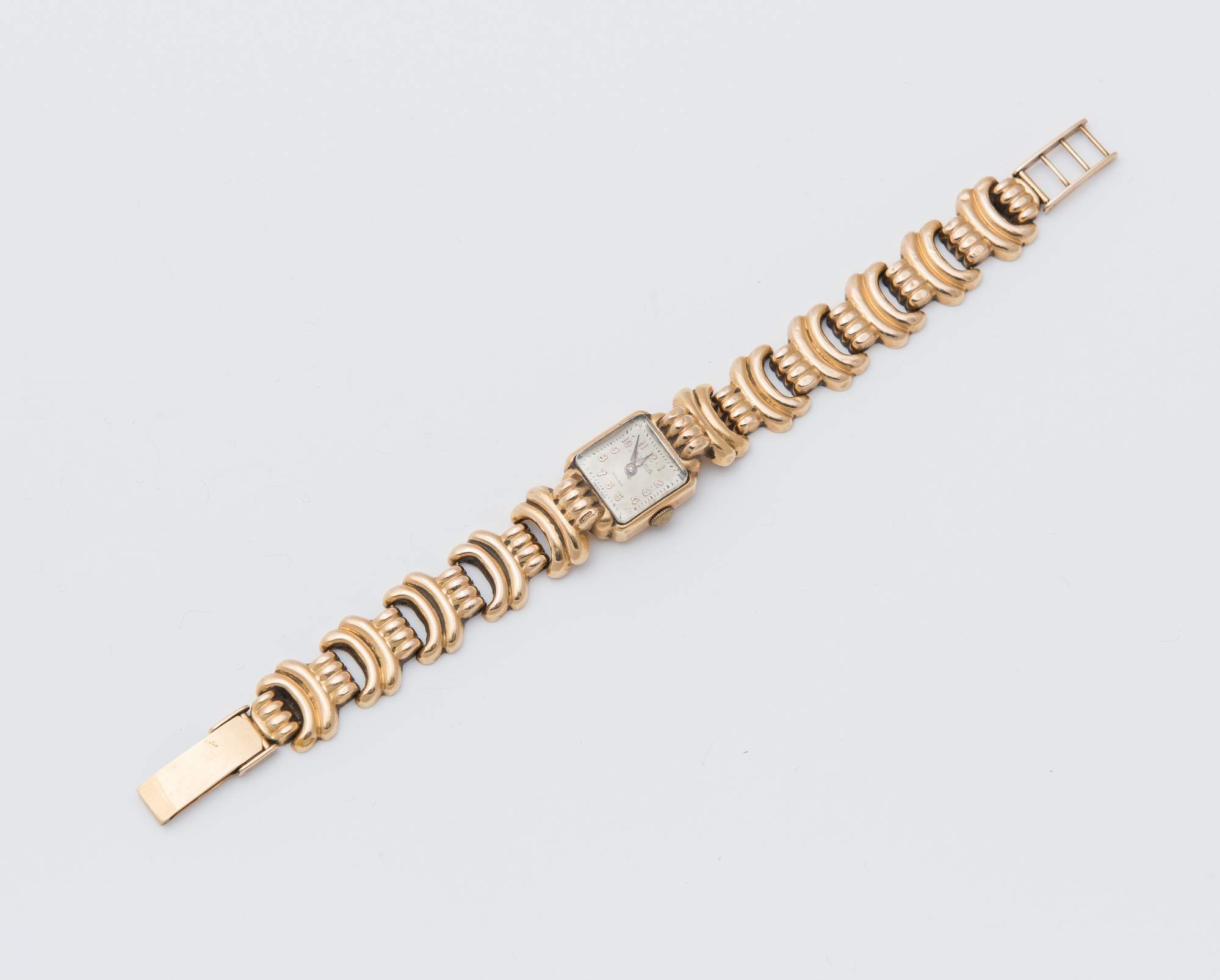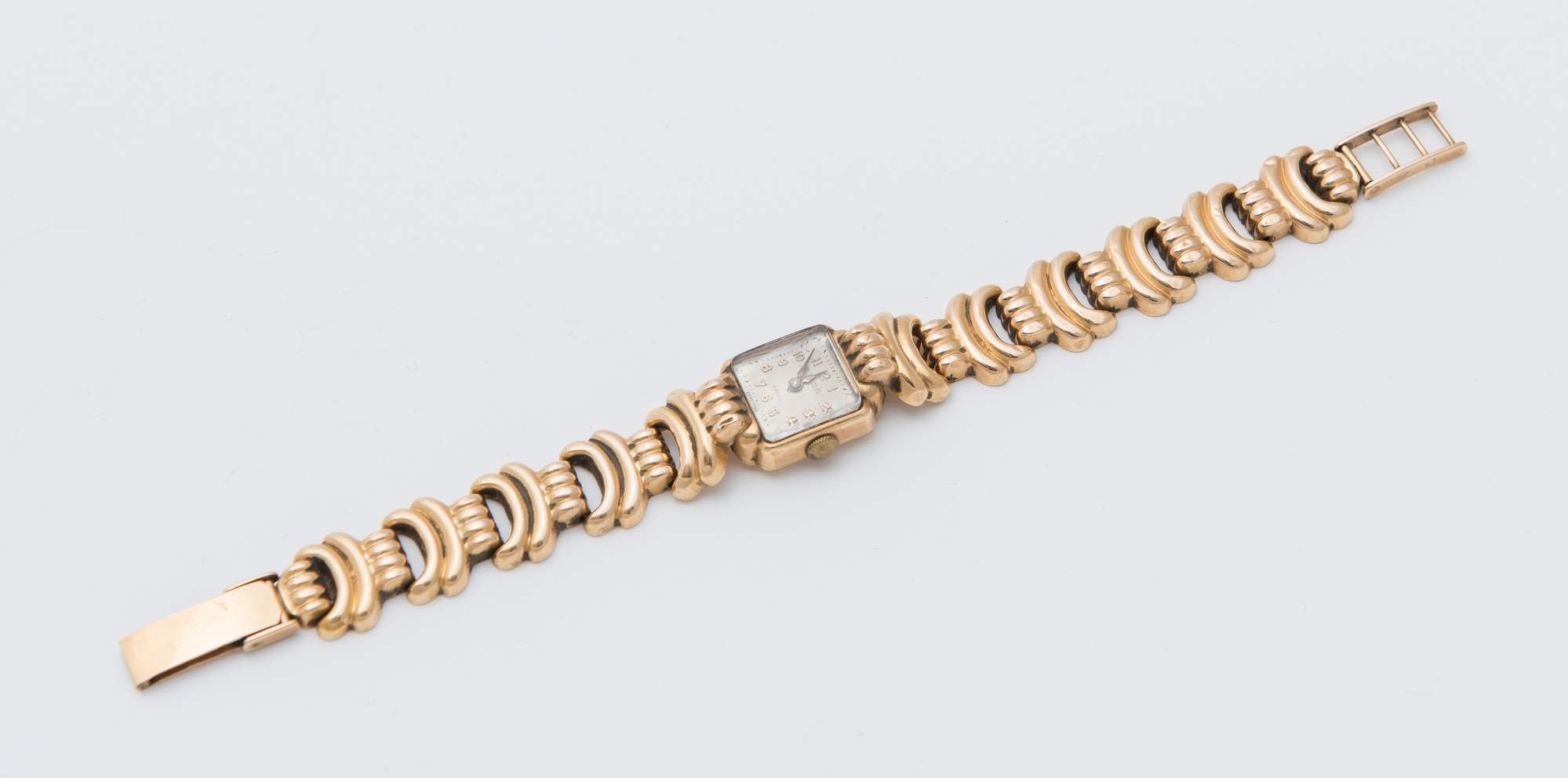 OROLOGIO PER SIGNORA IN ORO cassa carré in due corpi, quadrante con indici a numeri arabi, bracciale integrato in oro 18K, movimento a carica manuale. Si consiglia revisione. Peso complessivo 19,80 grammi.