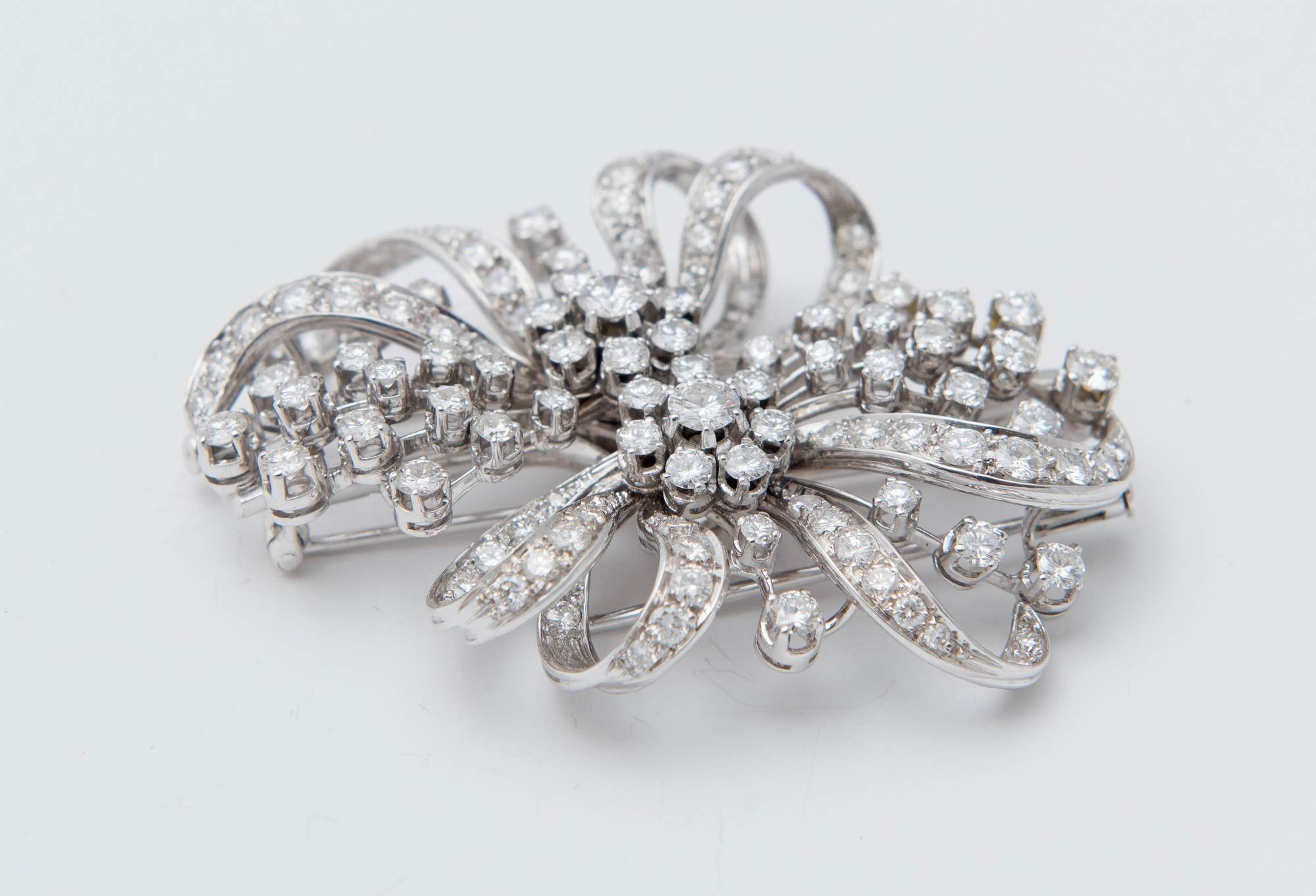 SPILLA IN ORO BIANCO E DIAMANTI In oro bianco 18K, di gusto floreale, interamente decorata con brillanti. Due diamanti di centro del peso stimato di 0.56 ct, peso complessivo dei diamanti 6.25 ct, colore indicativo F-G, purezza VVS. Peso complessivo 29,74 grammi.