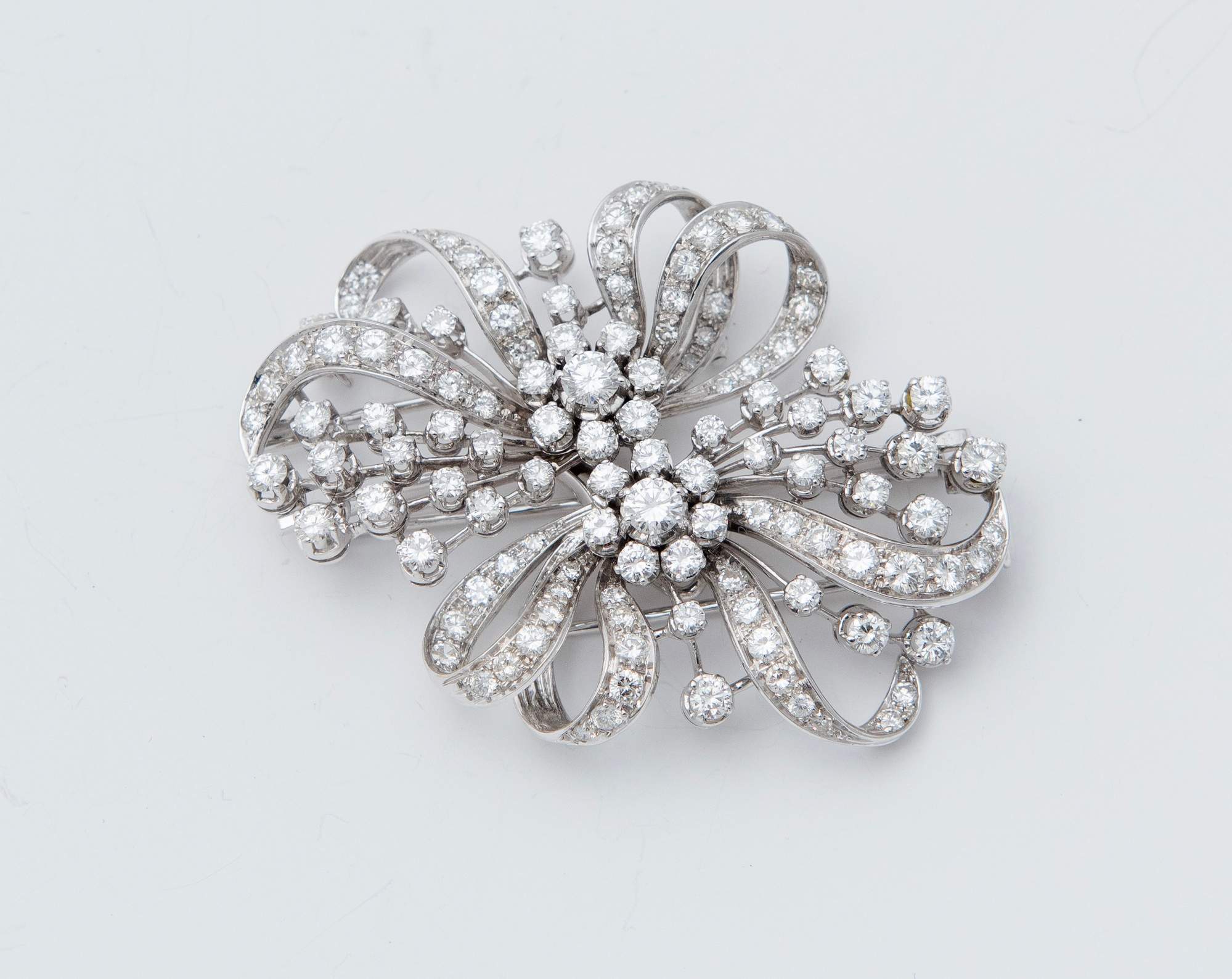 Lotto 91 | SPILLA IN ORO BIANCO E DIAMANTI In oro bianco 18K, di gusto floreale,...
