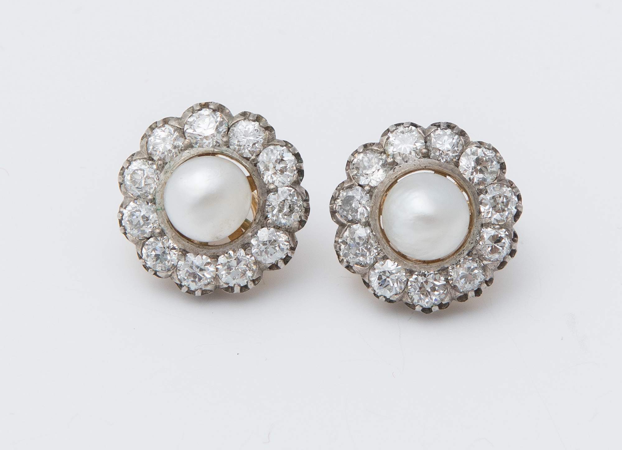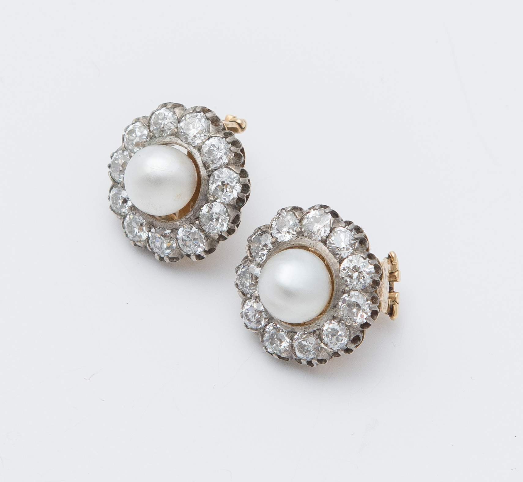 ORECCHINI IN ORO 18K CON PERLE E DIAMANTI ciascuno realizzato come una clip con perla semisferica mm 8.4 – 8.8 posta entro cornice di diamanti di vecchio taglio per un peso stimato di 5.70 ct. Peso complessivo: 12,90 grammi.