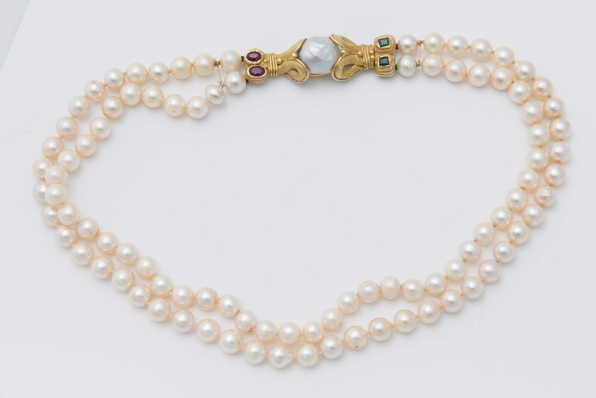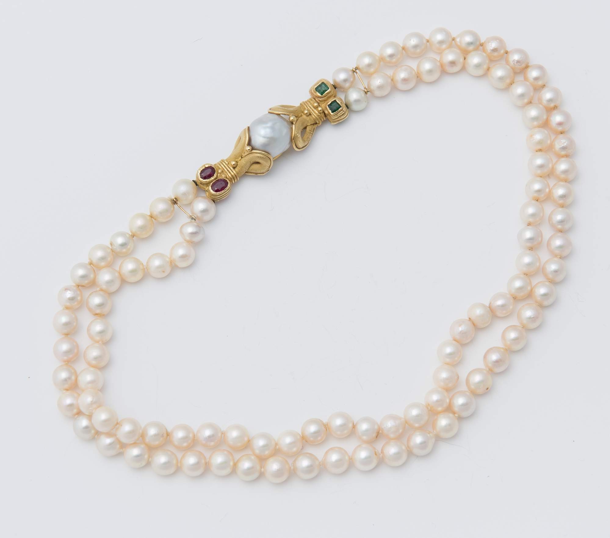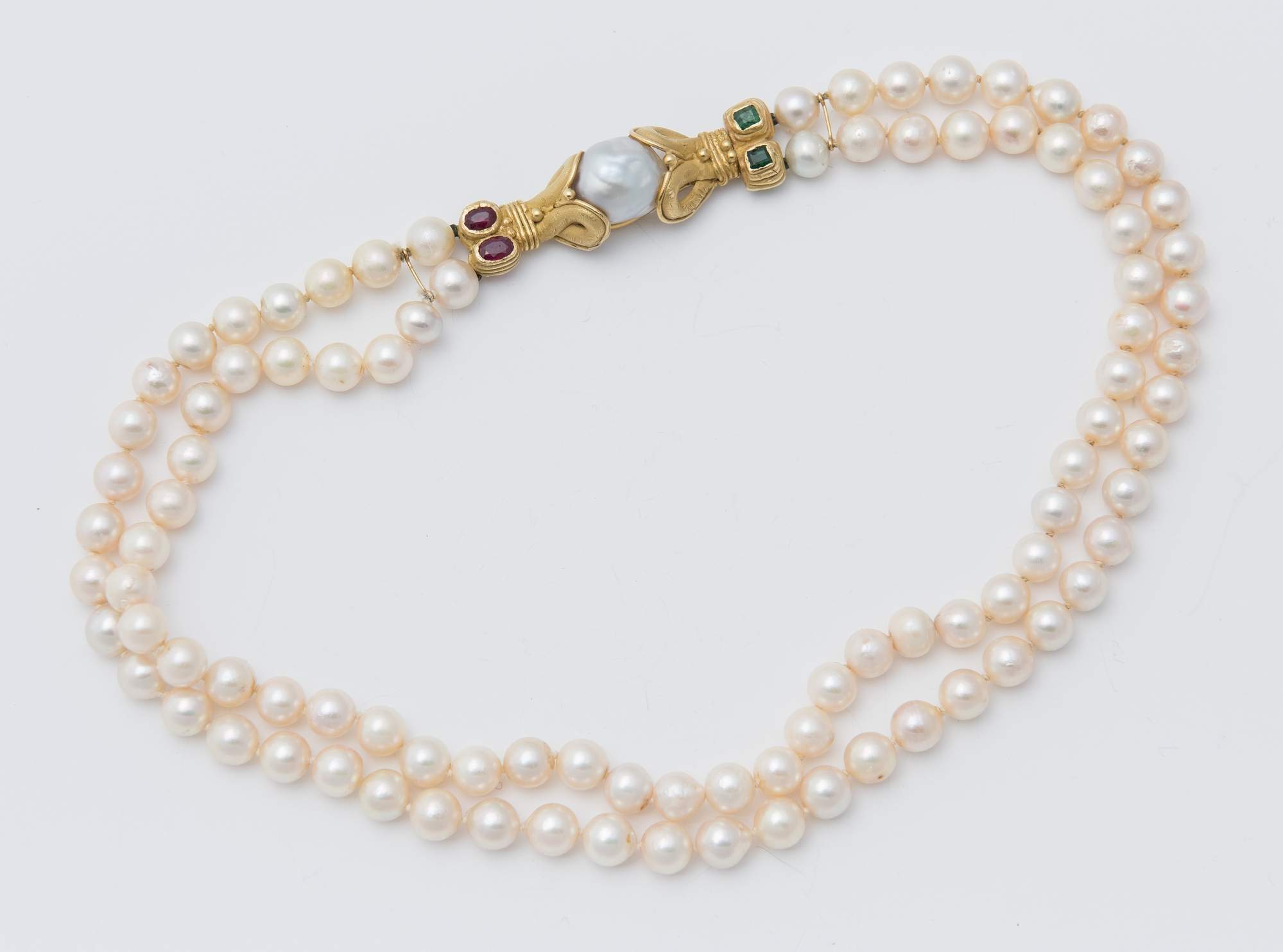 COLLANA DI PERLE, RUBINI E SMERALDI a due fili di perle coltivate di acqua...