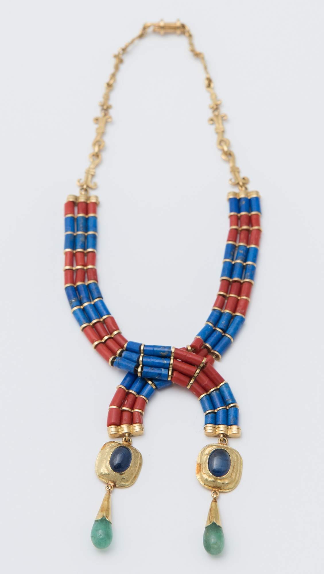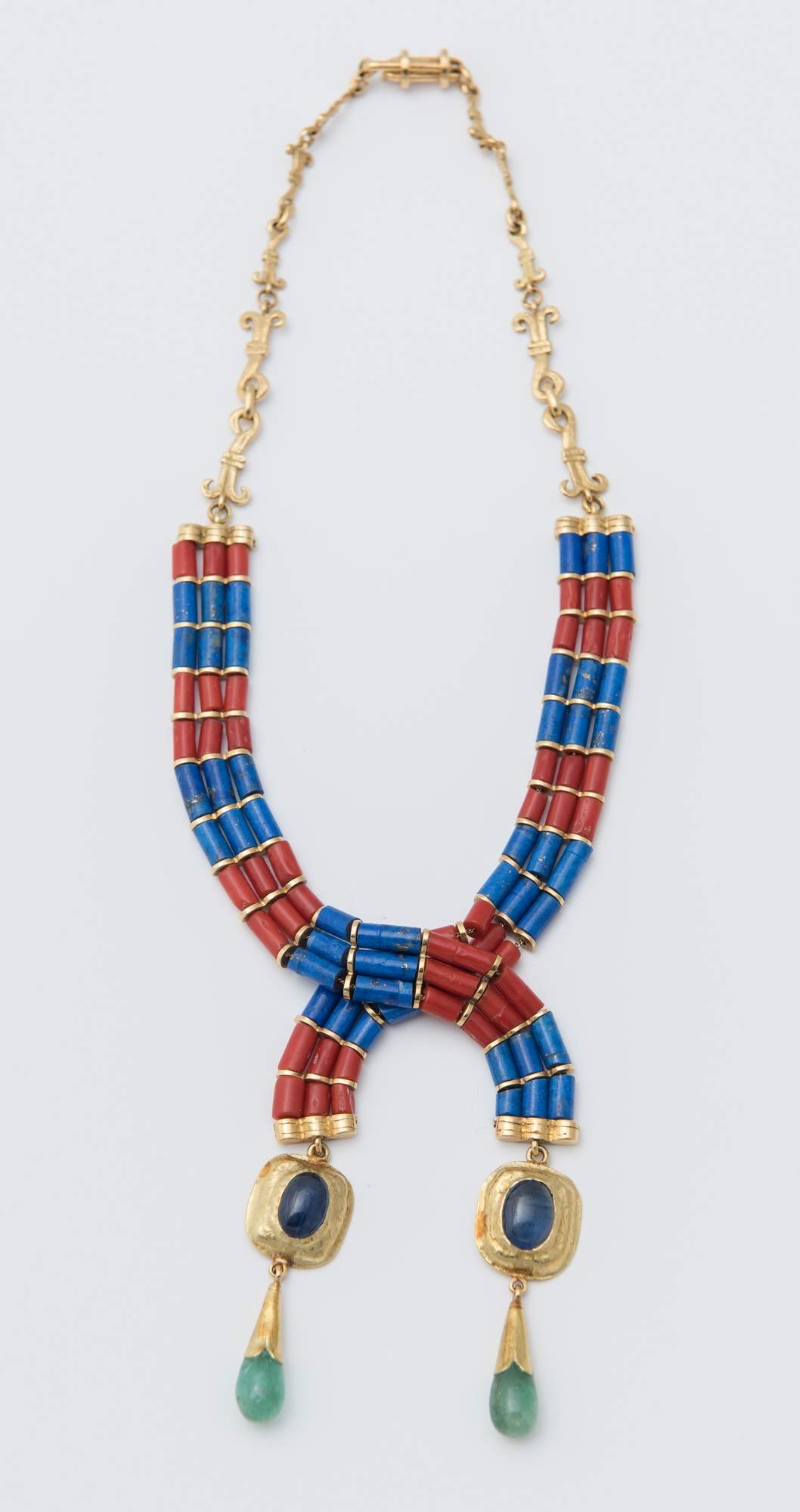 COLLANA IN ORO, CORALLI E LAPISLAZZULI realizzata con catena in oro 18K ed elemento frontale a tre file di barilotti di corallo e lapislazzuli a cui sono sospesi due pendenti con zaffiri e smeraldi cabochon. Peso complessivo 63,20 grammi. Gioiello firmato e datato al retro Brunetti Francesco 82/83. Gioiello esposto nella mostra "Il racconto della materia", Palazzo Garagnani, Crespellano di Valsamoggia, 22 settembre - 23 ottobre 2016. Gioiello pubblicato nel catalogo "Francesco Brunetti, il racconto della materia", 2016, pag. 79 (insieme al bozzetto preparatorio).