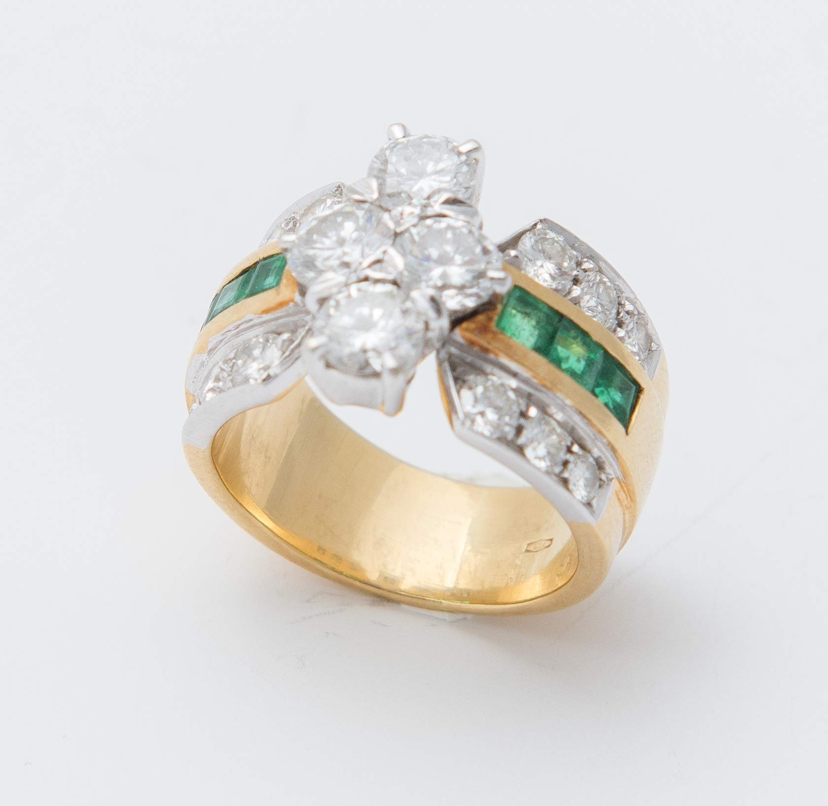 ANELLO CON DIAMANTI E SMERALDI in oro giallo e bianco 18K, disegnato come una fascia a linee alternate di smeraldi carré e brillanti centrata da quattro diamanti a brillante rotondo; peso stimato dei diamanti 2.32 ct; peso stimato degli smeraldi 0.75 ct. Peso complessivo 13,15 grammi.