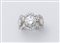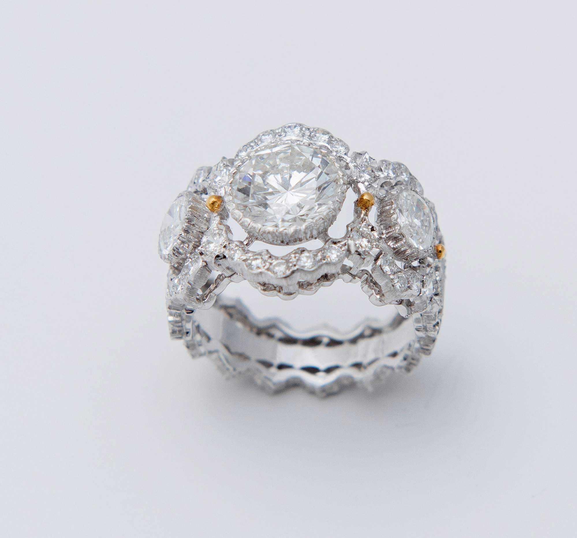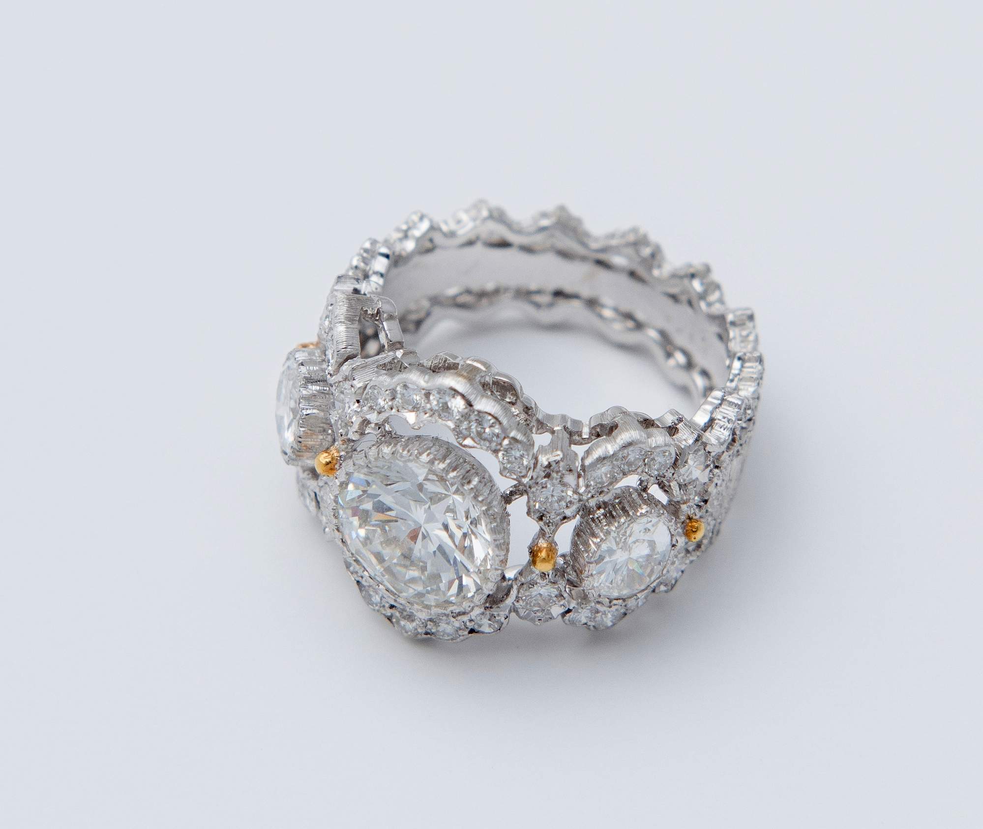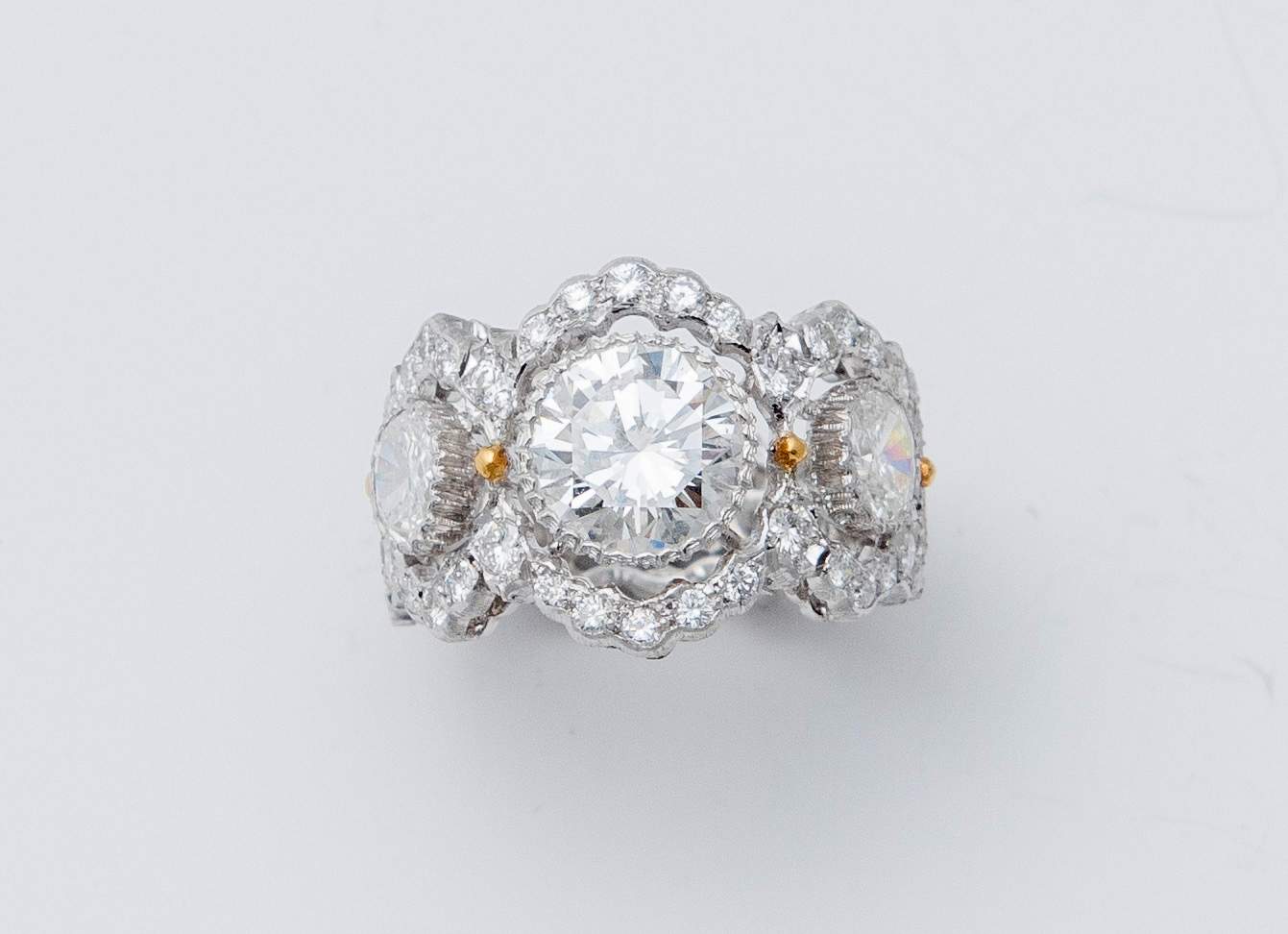 ANELLO CON DIAMANTI in oro bianco 18K cesellato, inciso e traforato, sagomato come una fascia centrata da grande diamante rotondo affiancato da due diamanti ovali e piccoli diamanti di contorno. Peso del diamante centrale 1,85 ct circa, colore H, purezza VVS; altri diamanti per un peso stimato di 0,80 ct. Peso complessivo 7,32 grammi.