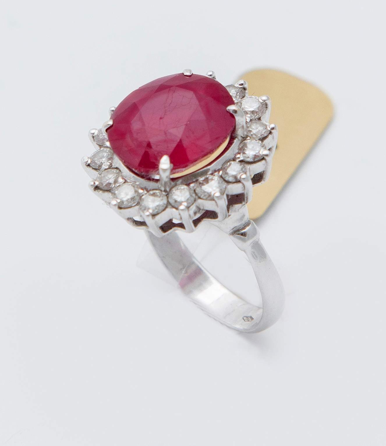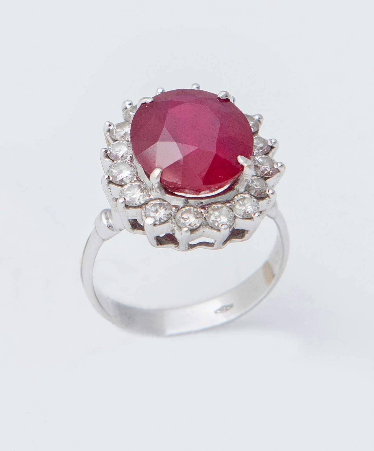 ANELLO CON RUBINO E DIAMANTI in oro bianco 18K, centrato da grande rubino ovale (indicazioni di trattamento) entro corolla di diamanti rotondi a brillante per un peso stimato di 1.10 ct circa. Peso complessivo 7,00 grammi.
