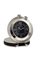 Sveglia da viaggio con cassa in acciaio con protezione del quadrante a cerniera che funge da piedistallo. Quadrante nero, a settori, con minuteria a binario chiusa e numeri arabi ai quarti.