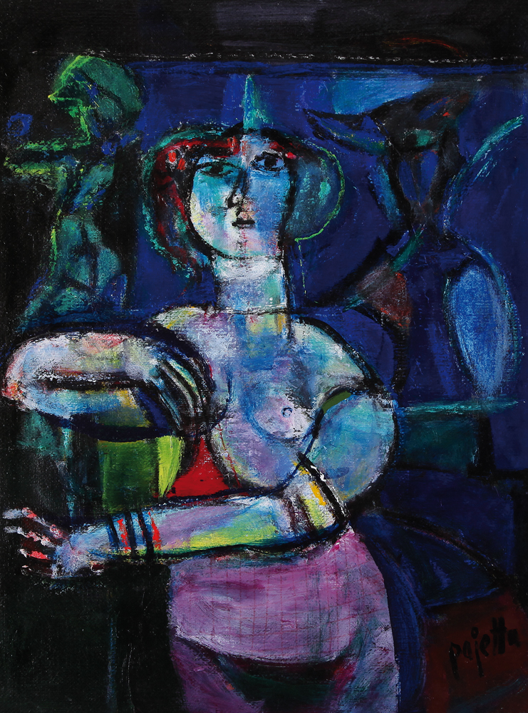 GUIDO PAJETTA Monza (Mi) 08/02/1898 - Milano 15/02/1987 Donna con fondo blu, (1970) acrilico su tela cm. 80x60, firma in basso a destra, pubblicato su "Guido Pajetta, catalogo generale ragionato dei dipinti", volume secondo, 1964-1987, a cura di Enrico Crispolti, Edizioni Mazzotta, al numero 1970/105, pagina 984.