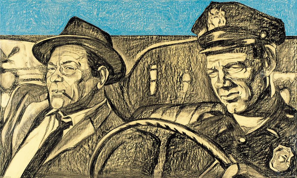 LUCA ZAMPETTI Camerino (MC) 1966 Stavano arrivando il tenente Schrank e l'agente Krupke, 2006 tecnica mista su carta applicata su tavola cm. 60x100, firma e anno in basso a sinistra, etichetta dell'artista, timbro e firma al retro, opera pubblicata sul catalogo della mostra "Luca Zampetti, West side story", tenutasi presso la Casa d'Arte Armanda Gori (PO) dal 26 novembre al 22 dicembre 2006, pagina 29, opera priva di cornice.