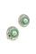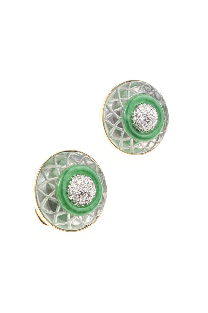 in oro giallo, a clip, con cristallo di rocca inciso a motivi geometrici, al centro dischi in giada verde e diamanti taglio brillante per totali ct 0,50 ca