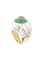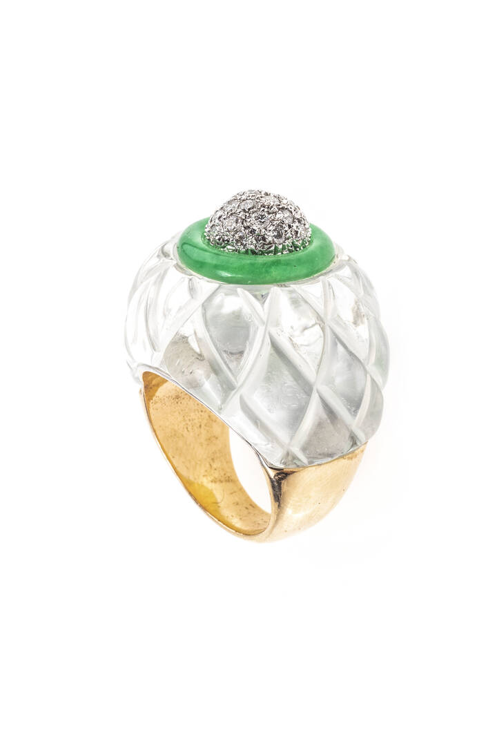 in oro giallo e bianco, sommità composta da cristallo di rocca inciso a motivo geometrico, al centro disco in giada verde con sfera in diamanti taglio brillante per totali ct 0,50 ca