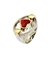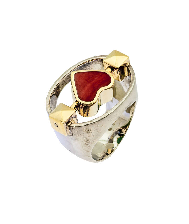 Particolare anello in oro giallo e bianco, firmato "J. Riviére", anno 2009, sommità con cuore basculante in malachite e pasta di corallo