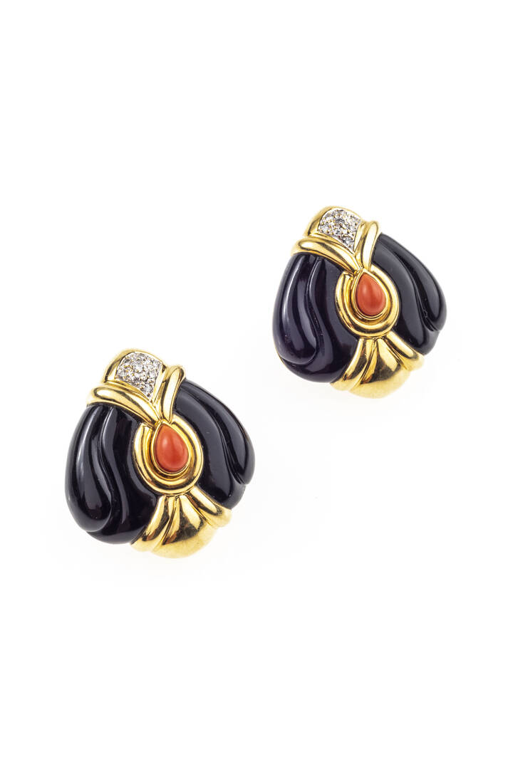 in oro giallo, a clip, con onice inciso e corallo rosso mediterraneo cabochon; diamanti taglio brillante a decoro per totali ct 0,15 ca