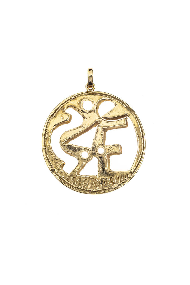 Ciondolo in oro giallo, firmato "Mastroianni", di forma rotonda con elementi astratti a decoro