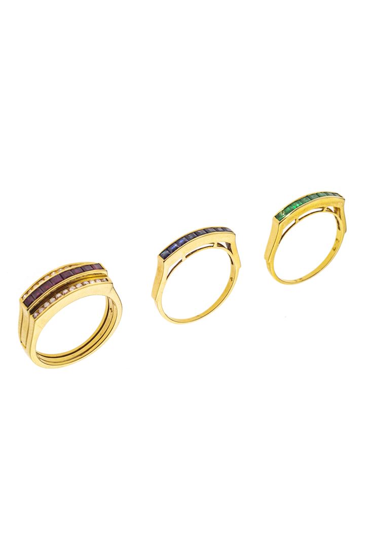 in oro giallo, con due file di diamanti taglio brillante per totali ct 0,20 ca e fascia interna intercambiabile in rubini taglio carré per totali ct 0,40 ca. Dotato di due anelli intercambiabili con fila di zaffiri per totali ct 0,40 ca e di smeraldi taglio carrè di ct 0,35 ca